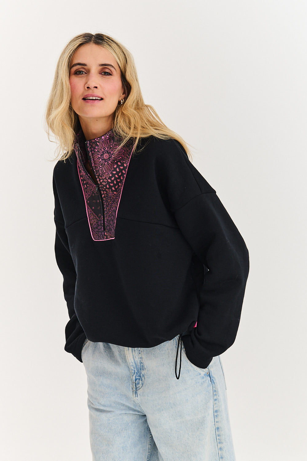 The main decoration is the panel on the chest and collar, covered with an intricate bandana-style pattern in shades of purple and pink. The same paisley motif can be found on a discreet patch on the back. The sweatshirt has a loose oversize cut and practical drawstrings at the bottom so you can adjust its shape. Perfect for jeans or leggings.