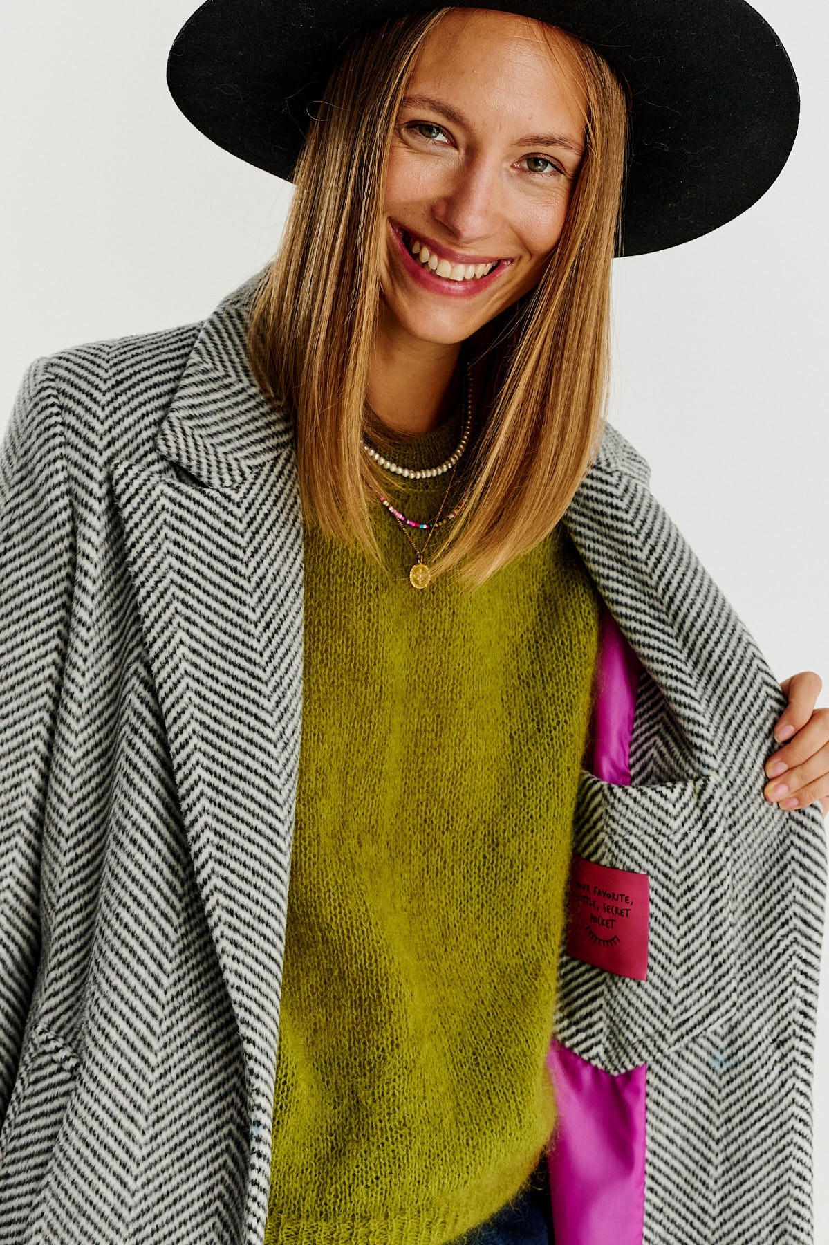 Tento kabát s rybím vzorem je volbou pro ženy, které chtějí vyniknout z davu. Klasická, jednoduchá forma v odstínu šedé je dokonalým základem vašeho šatníku, kousek, který se vám vždy bude hodit! Tento kousek je rozhodně must have pro podzimní sezónu!
