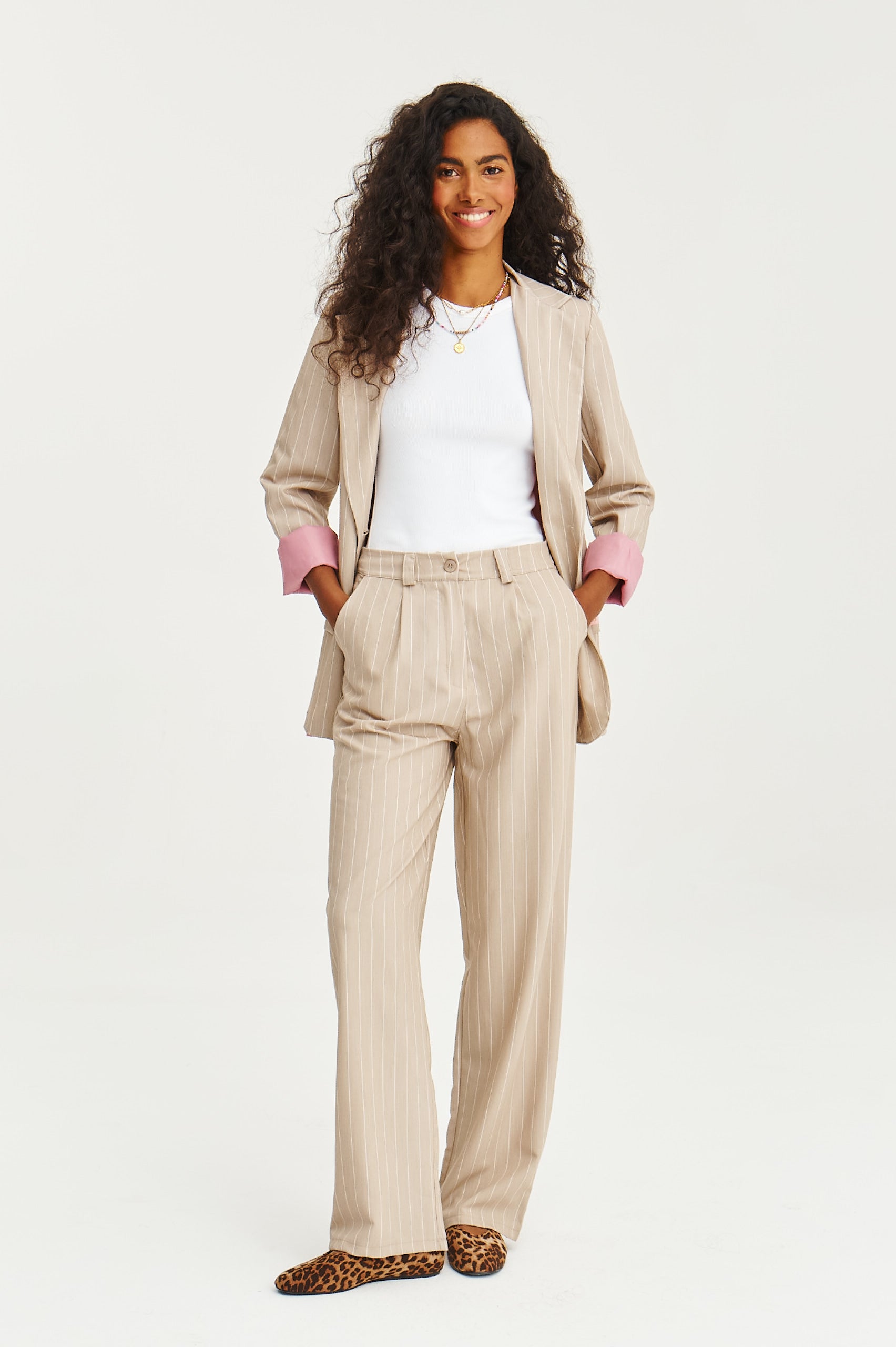 Kalhoty Bright Side jsou ideální volbou pro ty, kteří oceňují klasickou módu s nádechem moderní elegance, a to jak do práce, tak pro speciální příležitosti. Jejich jednoduchý, mírně volný střih zaručuje volnost pohybu, zatímco jemný proužkovaný vzor dodává charakter a zdůrazňuje formální, ale zároveň moderní vzhled. Tyto béžové proužkované kalhoty jsou navrženy s ohledem na univerzálnost – skvěle ladí se sakem jako komplet, ale i v ležérnějších outfitech.