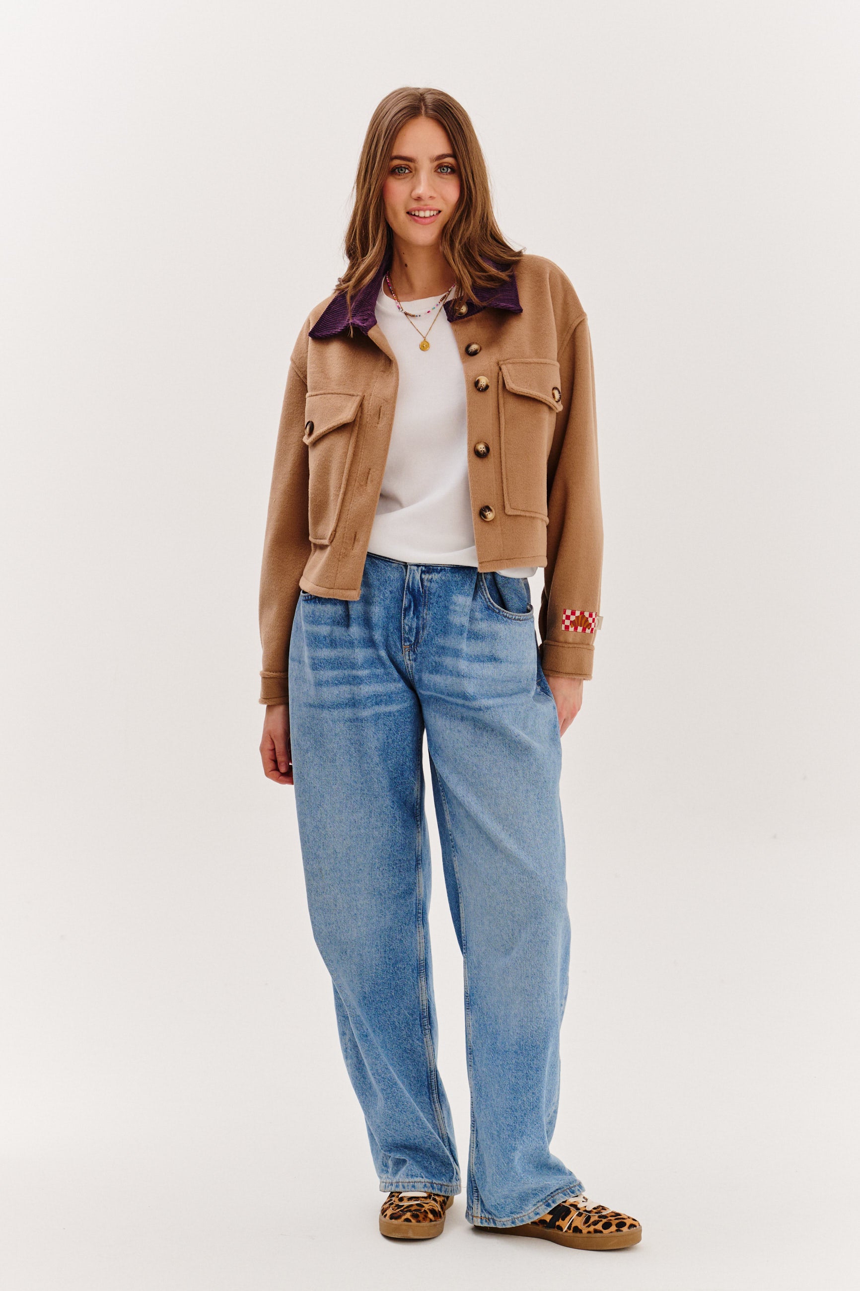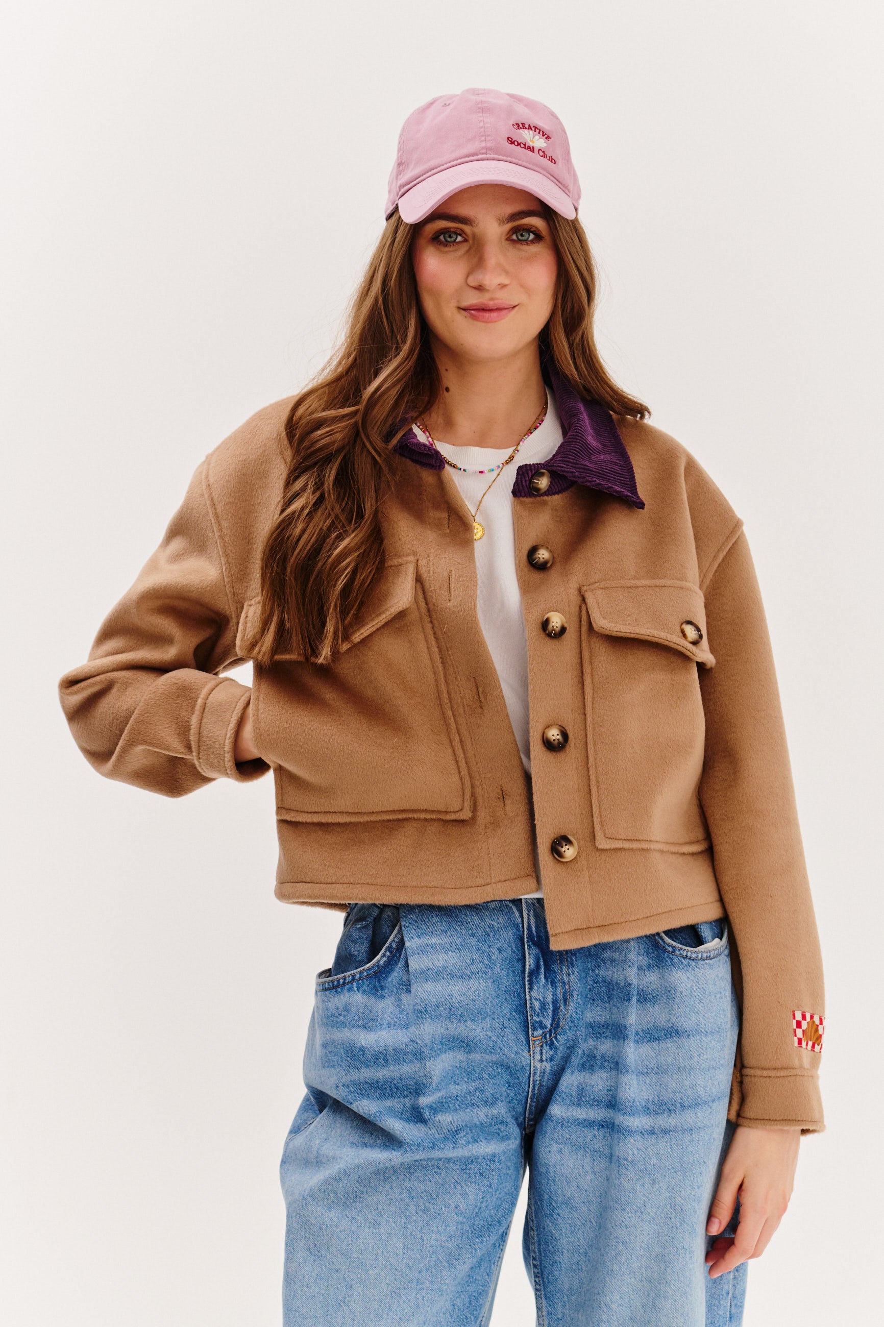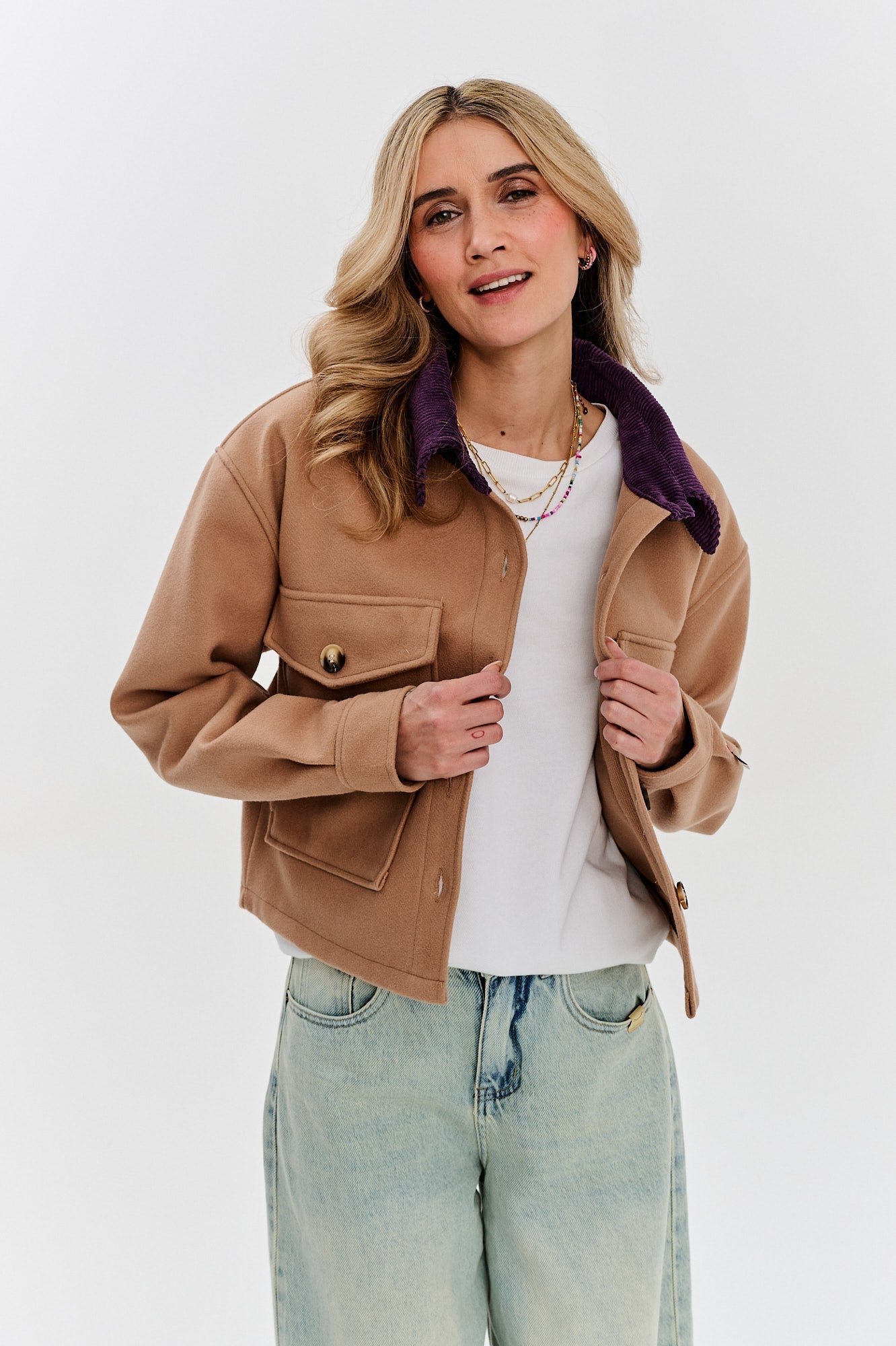 Cinnamon Hug bunda je dokonalou kombinací klasiky a tepla, útulnosti. Její zkrácený, krabicový střih inspirovaný košilovými bundami z ní dělá ideální volbu pro ležérní, městský styl. Béžový odstín základní látky jí dodává jemnou eleganci, zatímco kontrastní manšestrový límec v tmavě fialové barvě zvýrazňuje tvar a odkazuje na klasické svrchní oděvy.