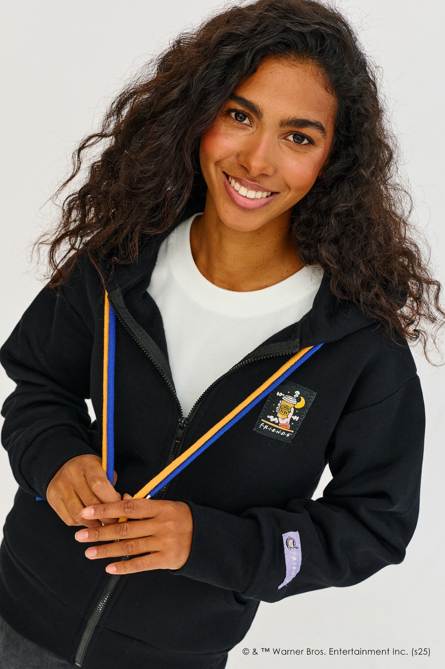 Zapínací mikina Coffee Break je inspirována kultovním televizním seriálem „Přátelé“. Na přední straně je vyšitá aplikace zobrazující šálek kávy a nápis „Central Perk“. Kontrastní žluté a modré šňůrky u kapuce a funkční klokánkové kapsy s detaily potištěnými na lemu dodávají mikině jedinečný charakter. Zadní část mikiny zdobí velká, barevná grafika s nápisem „But First Central Perk Coffee“, doplněná motivy šálků kávy a retro designy. Na rukávu je našitý nášivka s logem „Friends“ a fialový štítek se šálkem kávy ve spodní části dodává celku soudržnost a charakter.