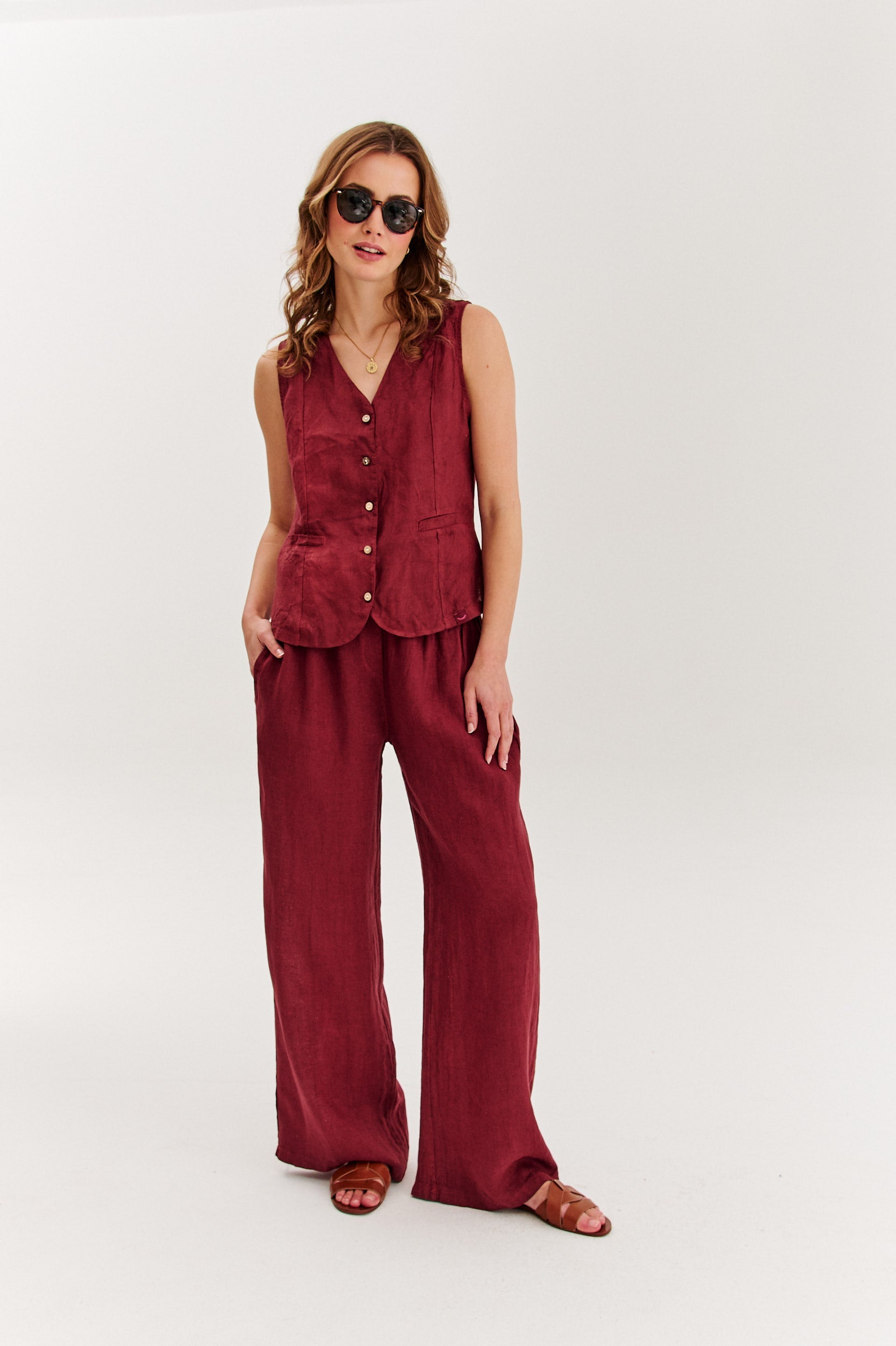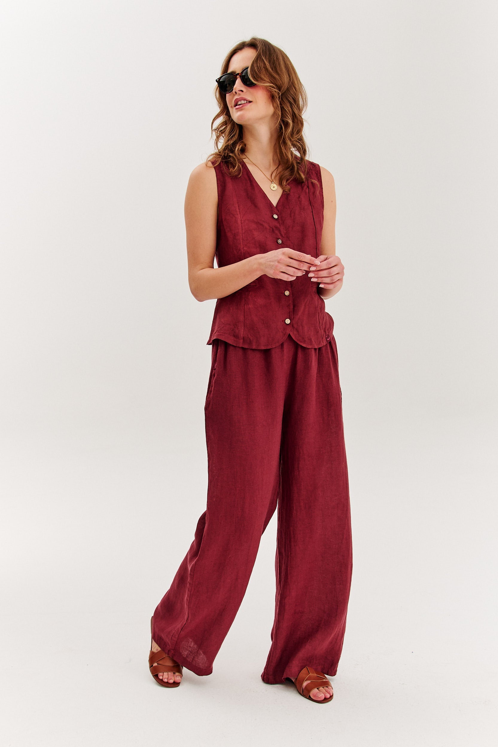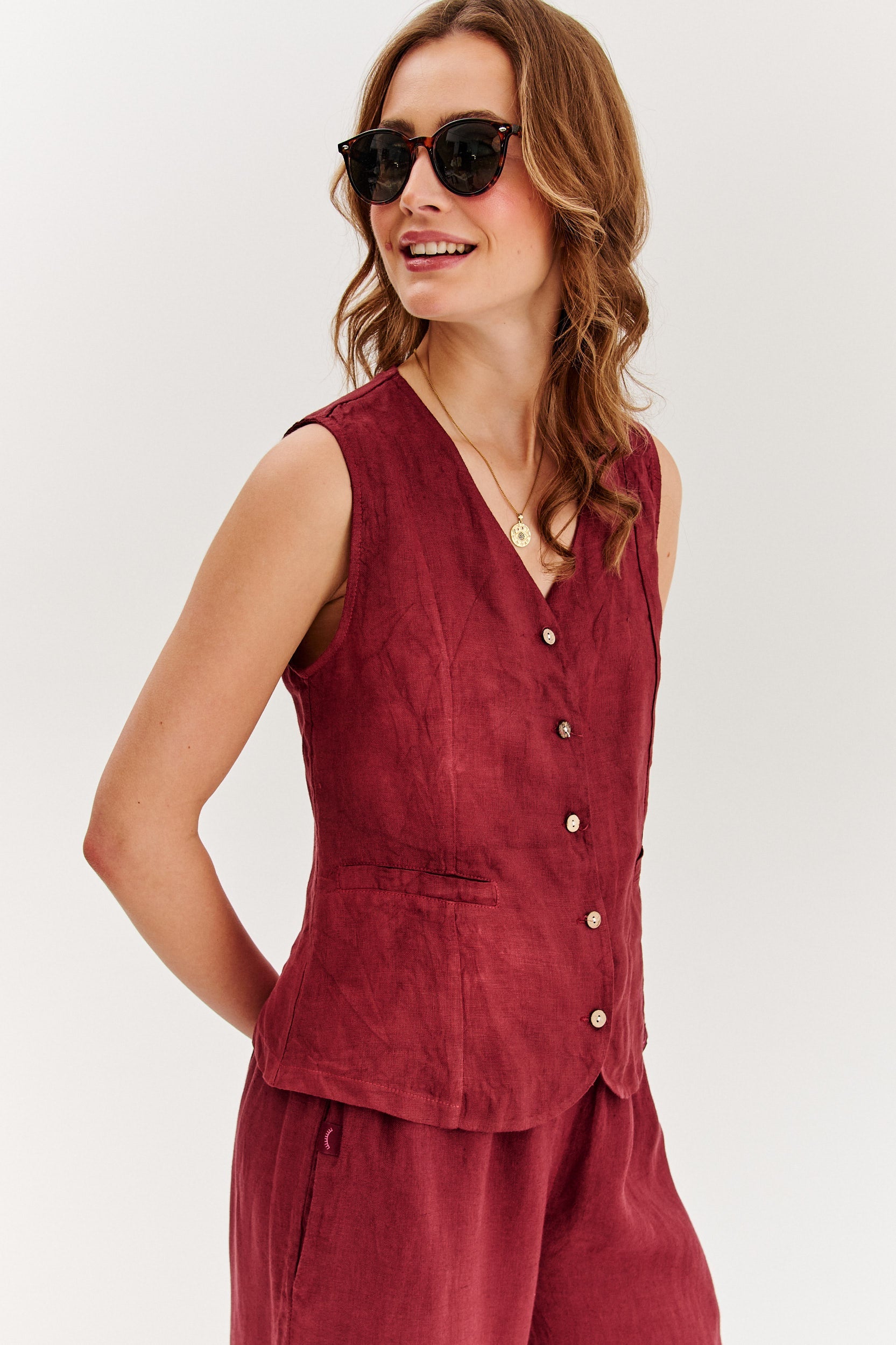 Lněná vesta Dusty Wine je ženským odkazem na klasické krejčovství s moderním boho nádechem. Navržena tak, aby jemně zvýraznila pas a doplněná kokosovými knoflíky, její hluboký vínově červený odstín z ní dělá výrazný, ale všestranný letní kousek.