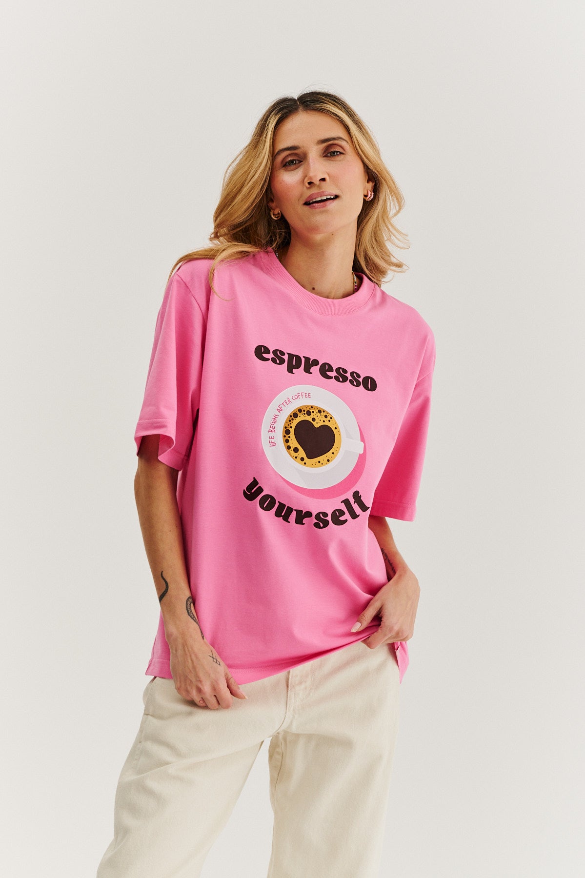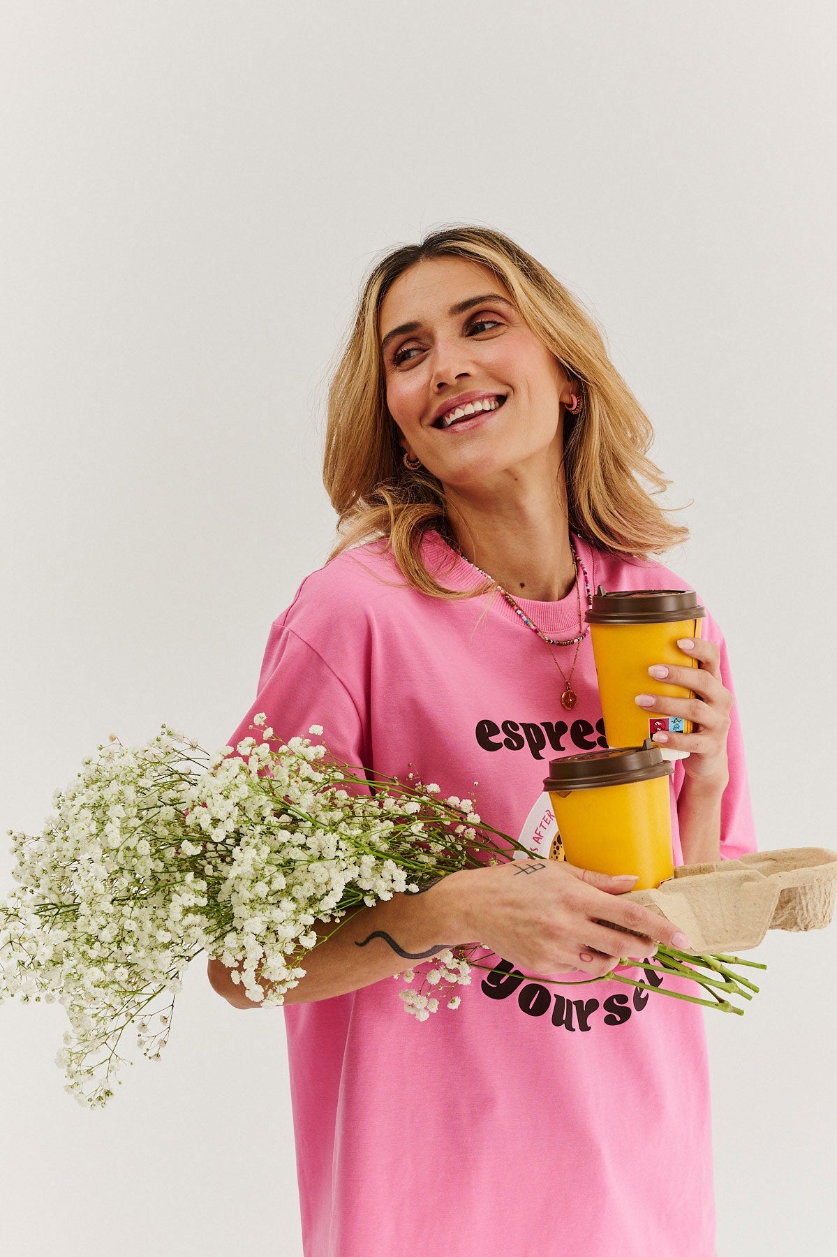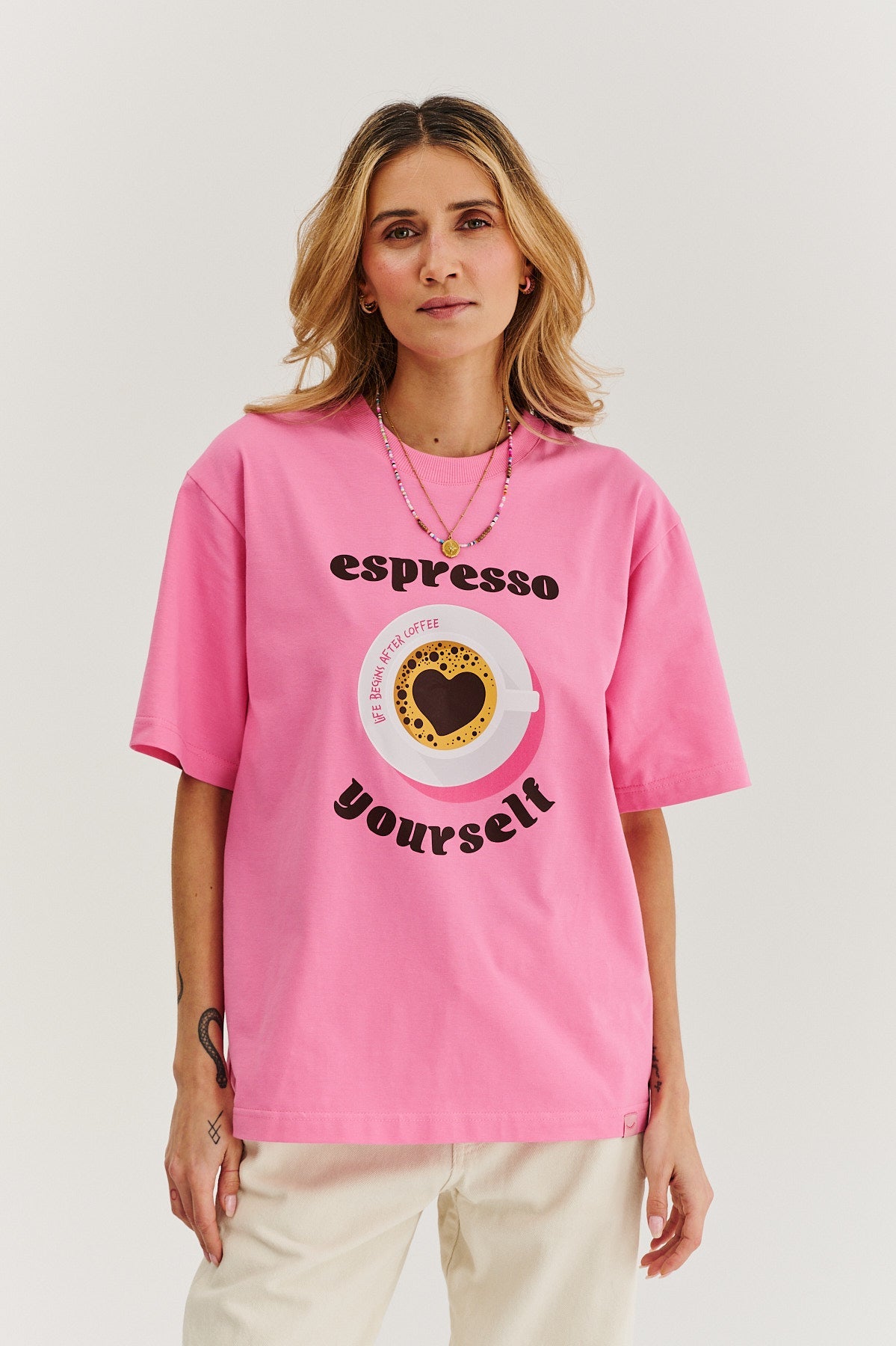 Tričko Espresso Yourself je určeno všem milovníkům kávy a pozitivní energie! Tento roztomilý růžový model se zábavným potiskem šálku espressa se srdcem a sloganem „Espresso Yourself“ dodá charakter každému outfitu.