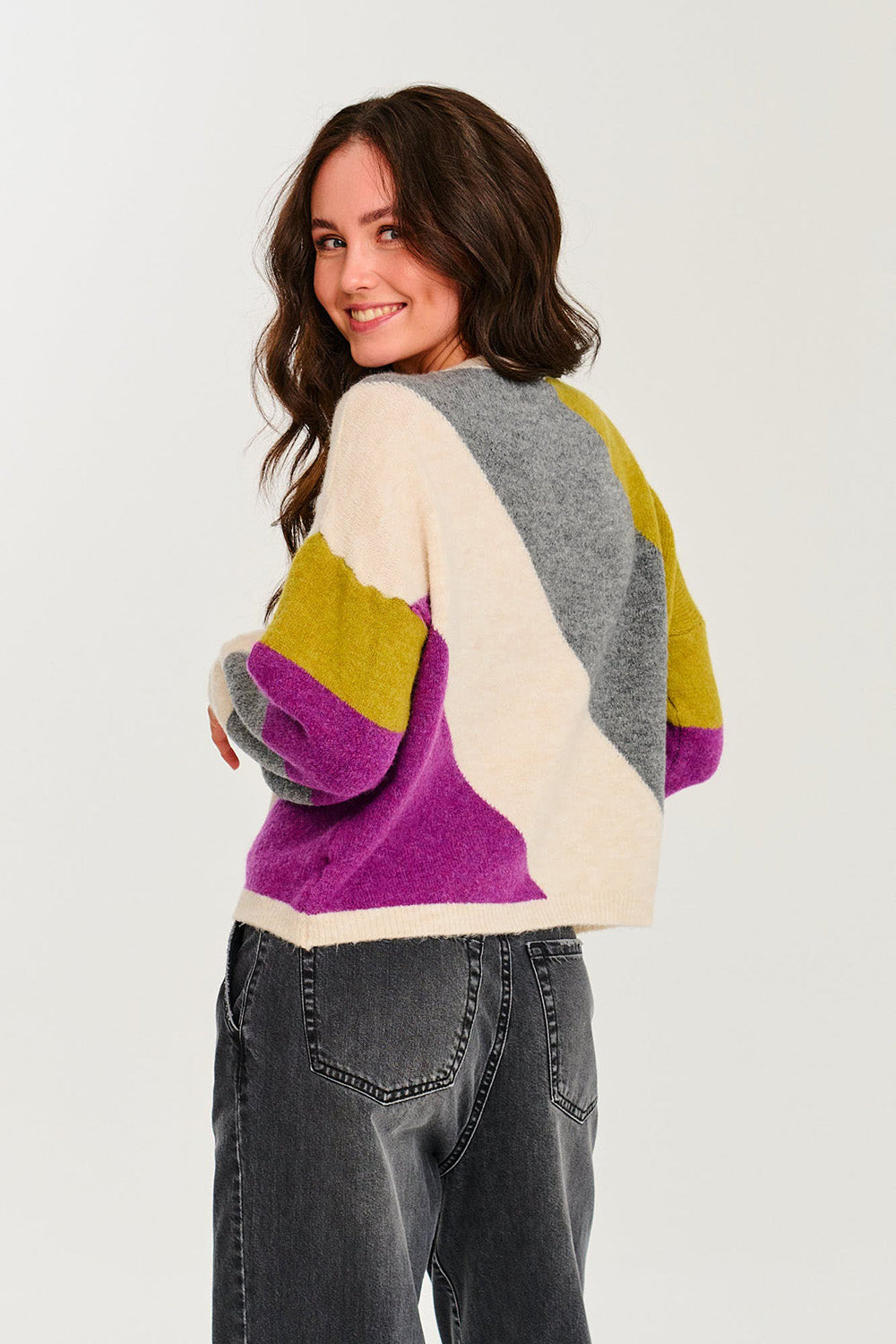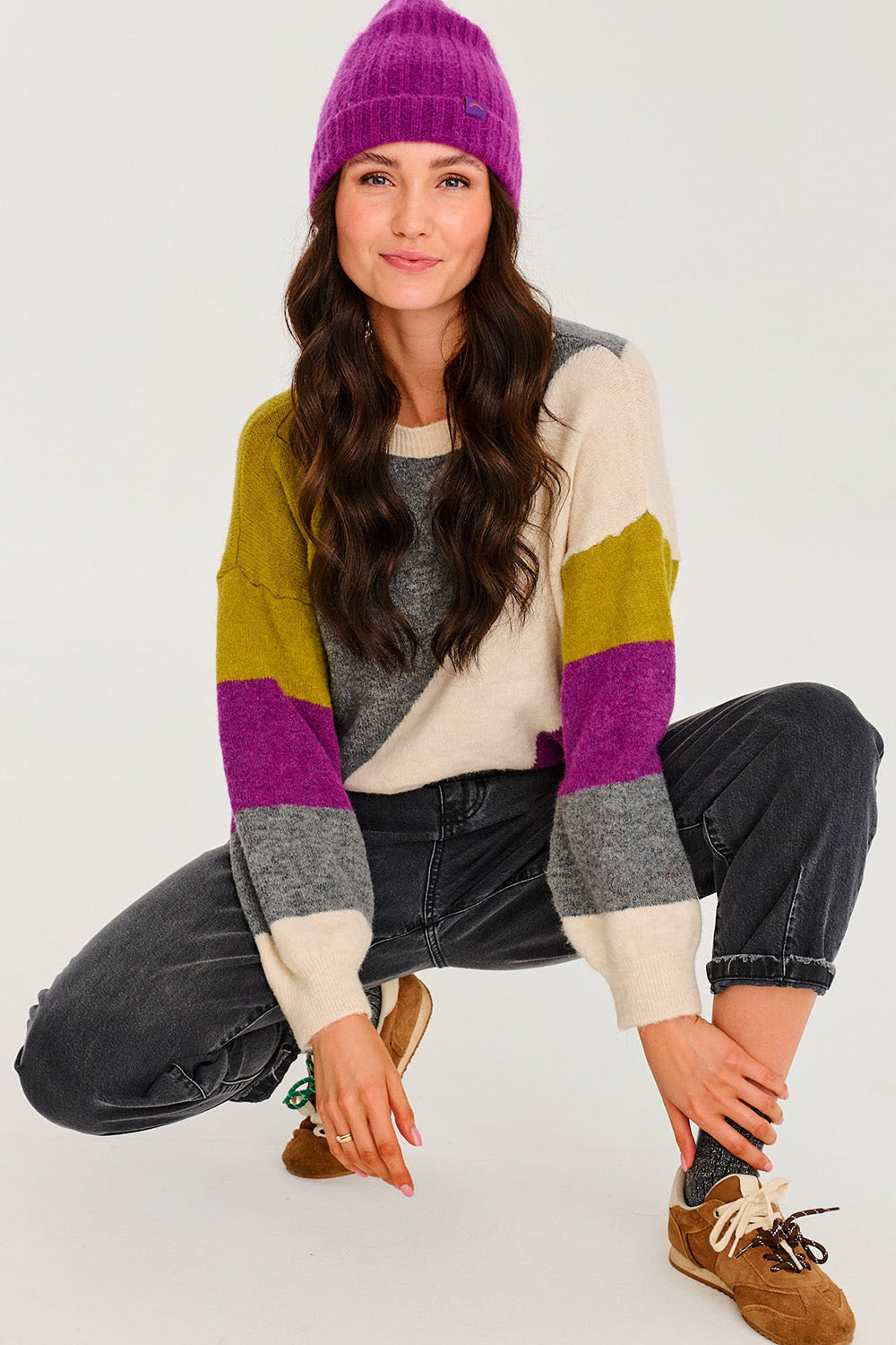 Svetr Eternal Shift je model, který upoutá pozornost svou neobvyklou kombinací barev a tvarů. Geometrické pruhy v odstínech limetkově zelené, tmavě fialové, tlumeně šedé a jemně bílé vytvářejí jedinečný kontrast, který oživí každý outfit. Tento moderní design spojuje odvahu a jemnost, dokonale odpovídá módě na originální, výrazné svetry.