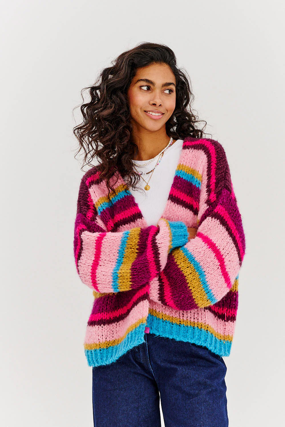 Kardigan Heartbeat je kombinací klasiky a výraznosti. Barevný pruhovaný vzor mu dodává nekonvenční vzhled a kontrastní lemy přidávají jemnou originalitu. Tento model vás nechá vyniknout v davu a dodá vašemu stylu jedinečný nádech.