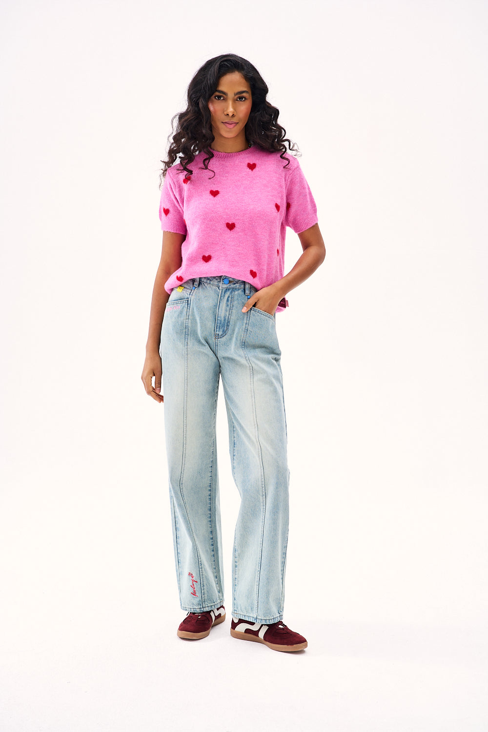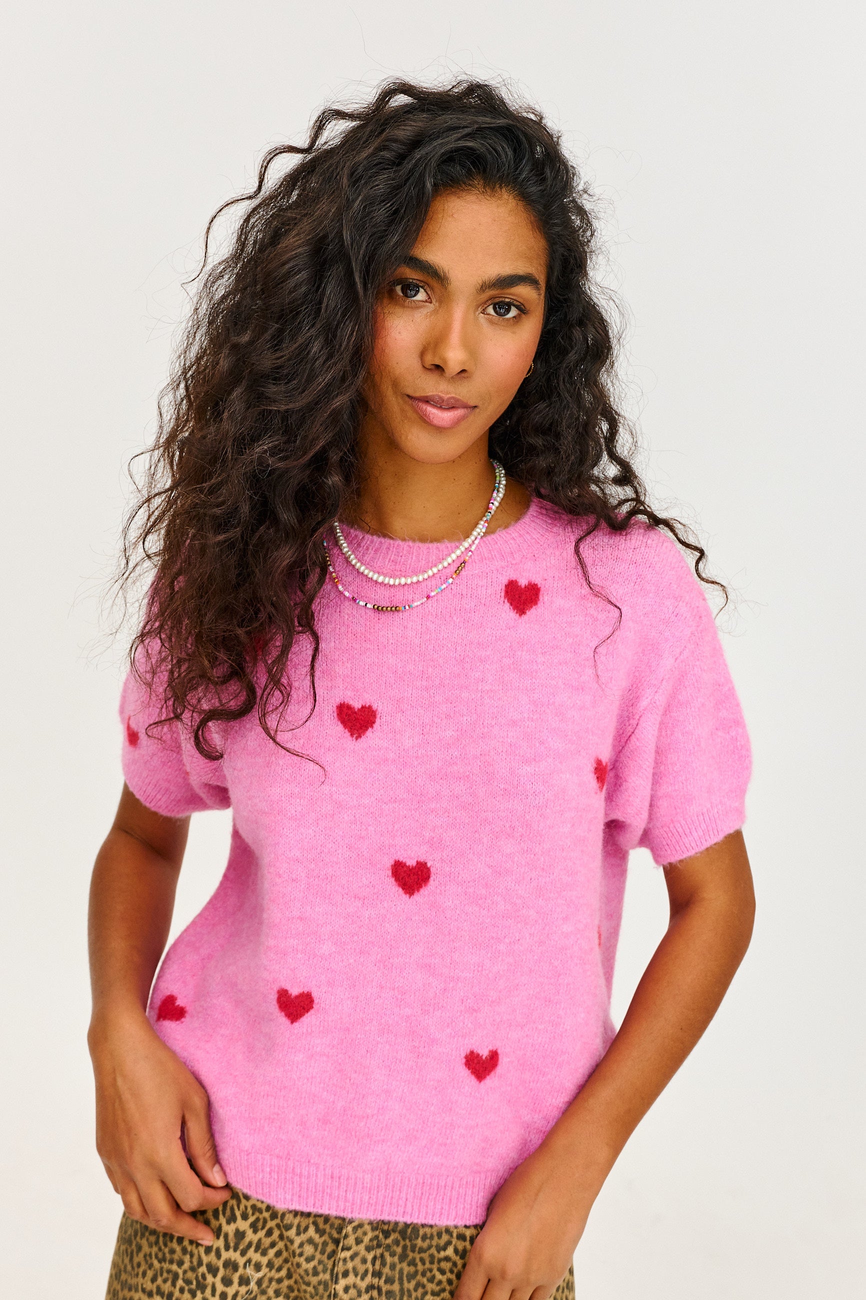 Láska na první oblečení! Svetr Heartbeat s krátkým rukávem v odstínu růžové s roztomilými červenými srdíčky je nabídkou pro ty, kteří chtějí do svého stylu přidat trochu tepla a romantiky. Krátké rukávy a jemný materiál z něj dělají ideální volbu na jarní dny a letní večery, ale také na teplejší dny zimy a podzimu.