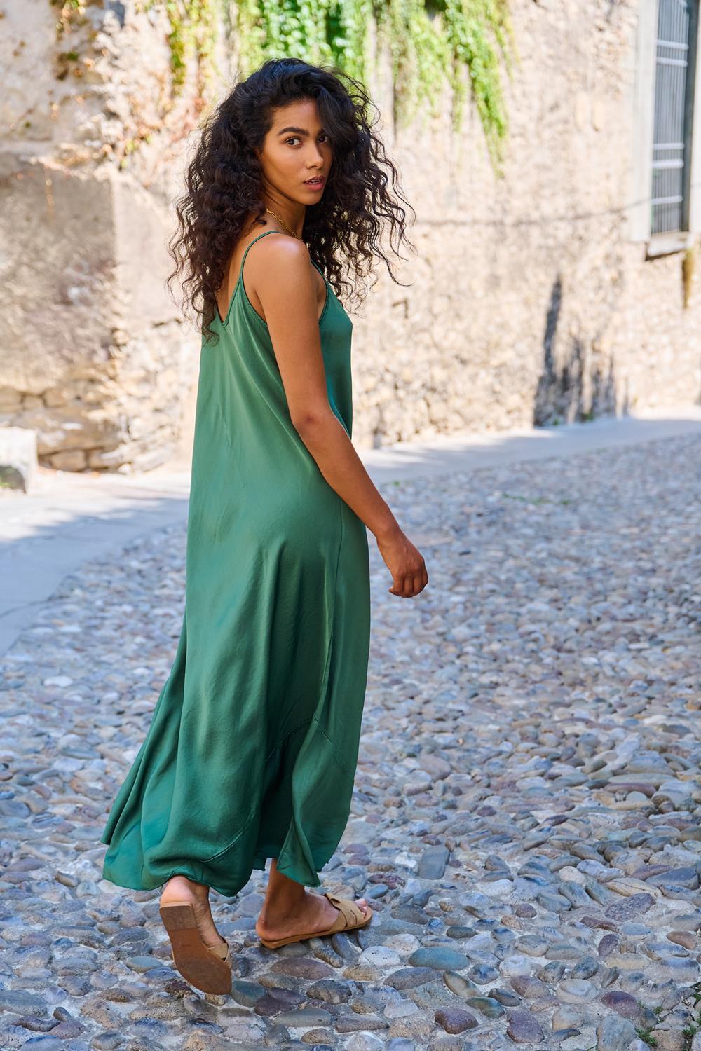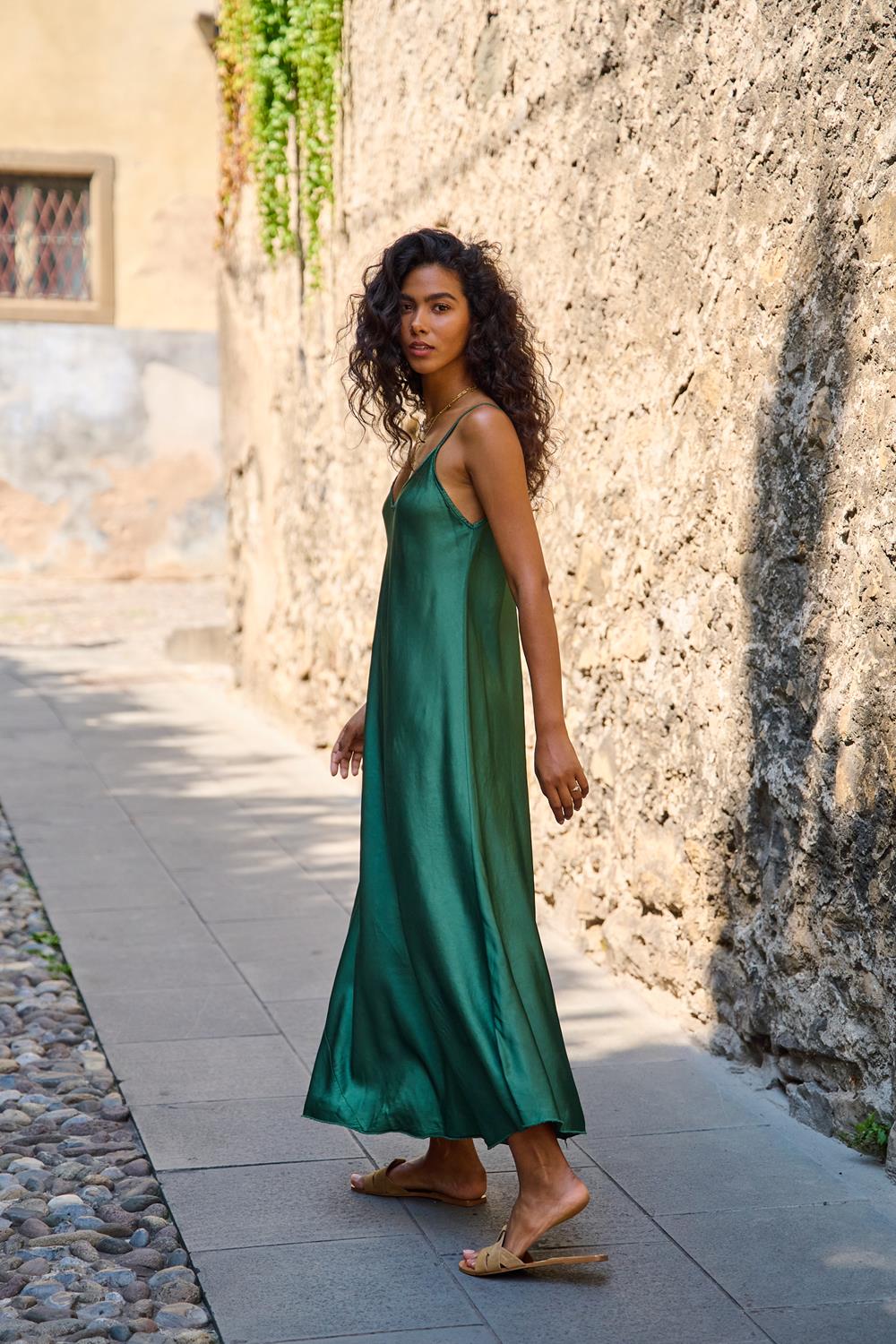 Rovný střih zvýrazňuje přirozenou siluetu a zároveň poskytuje volnost pohybu. Hluboké výstřihy vpředu i vzadu dodávají modernost a pocit vzdušnosti. Tenká ramínka a hluboký odstín zelené v kombinaci s lesklou látkou dávají šatům jedinečný charakter. Ideální pro výjimečné příležitosti nebo jako elegantní volba na večerní vycházky. Tyto šaty spojují klasiku s moderním stylem.