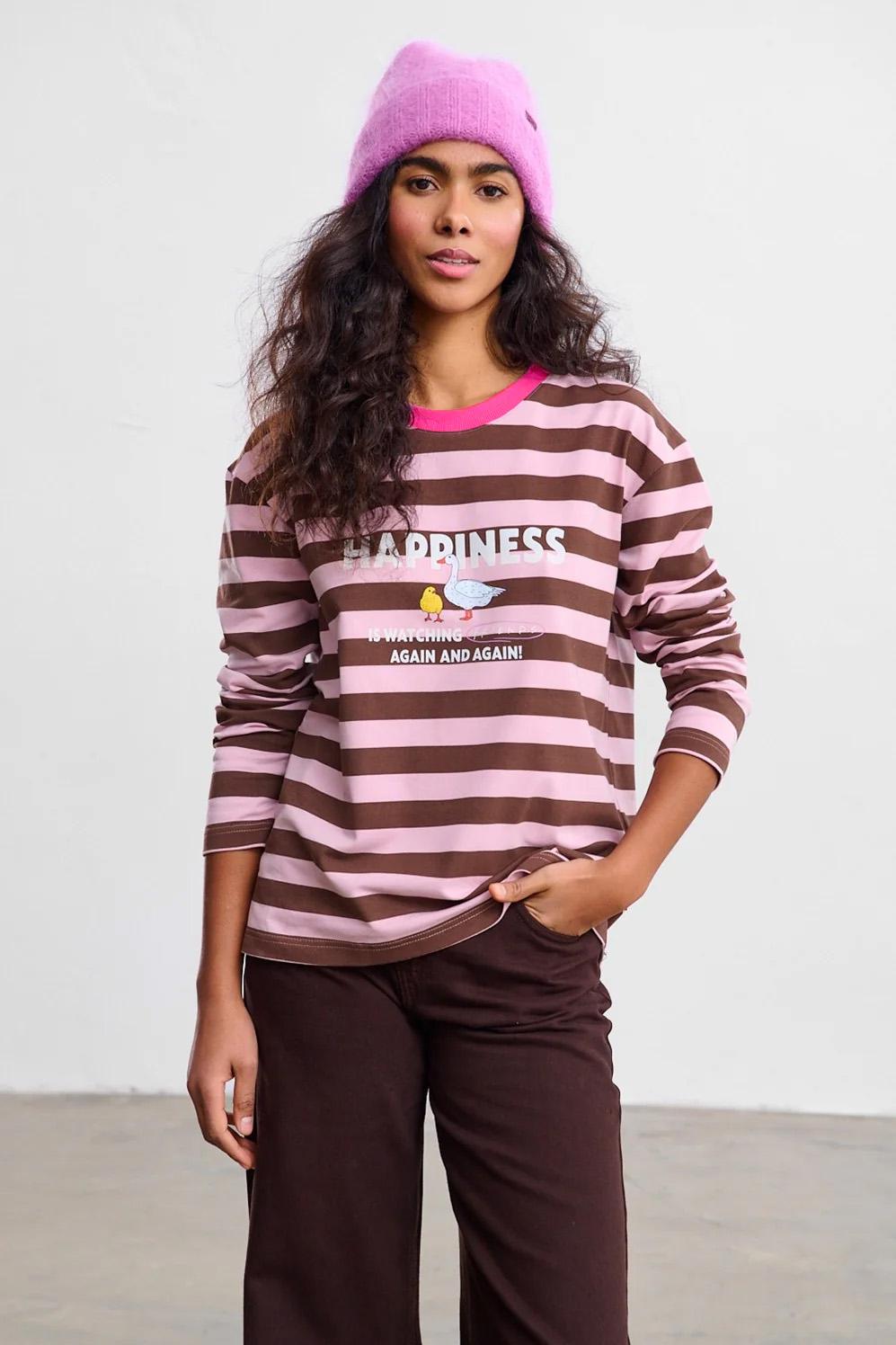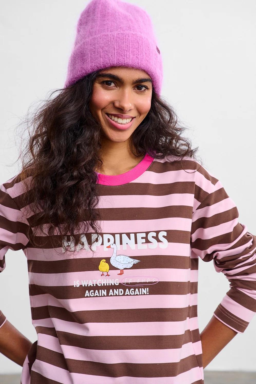 Watching Friends Longsleeve je určen pro ty, kteří milují klasiku s neotřelým nádechem. Hnědé a šedé pruhy a fialový žebrovaný výstřih vytvářejí pozadí pro nostalgické grafiky. Na přední straně je slogan, který definuje štěstí jako sledování „Přátel“.