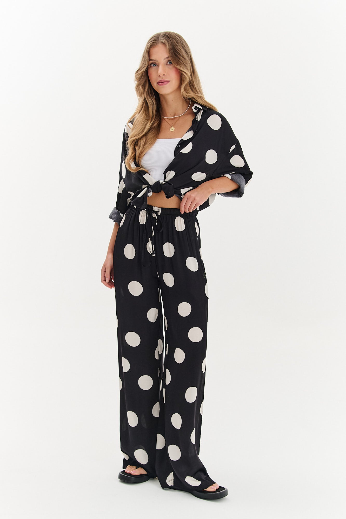 Široké kalhoty Lucky Dots jsou ideální volbou na léto – lehké, pohodlné a plné charakteru. Vyrobené z viskózového saténu, upoutají pozornost velkým puntíkovaným potiskem, který dodává stylingům hravý a lehce retro nádech.