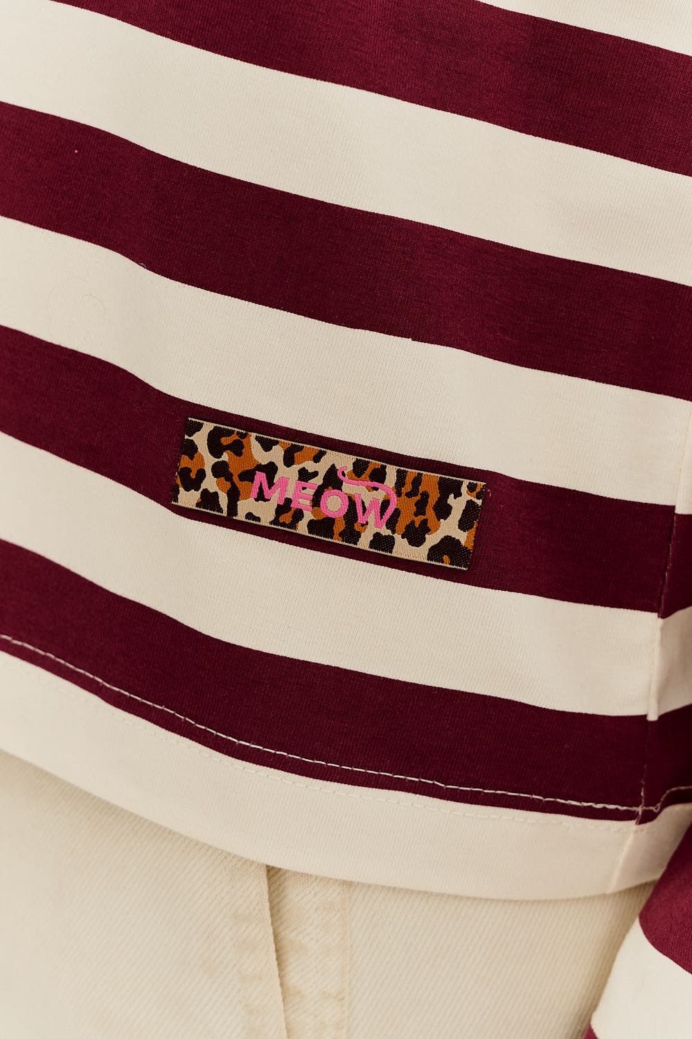 Výraznost a nadčasovost v jednom – tak bychom popsali Meow longsleeve. Tato jedinečná halenka s dlouhým rukávem se vyznačuje vzorem vodorovných pruhů v bordó a krémové barvě, což jí dodává moderní, ale zároveň nadčasový charakter. Kontrastní žlutý límec přidává výrazný a originální prvek.