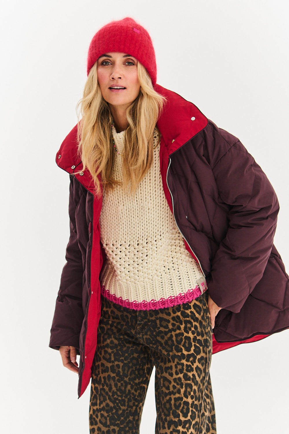 The color of deep maroon is noble and universal, and the red lining of the collar is a subtle but distinctive detail. The jacket is fastened with discreet press studs, which emphasizes its clean form. It is ideal for both elegant pants and casual jeans.