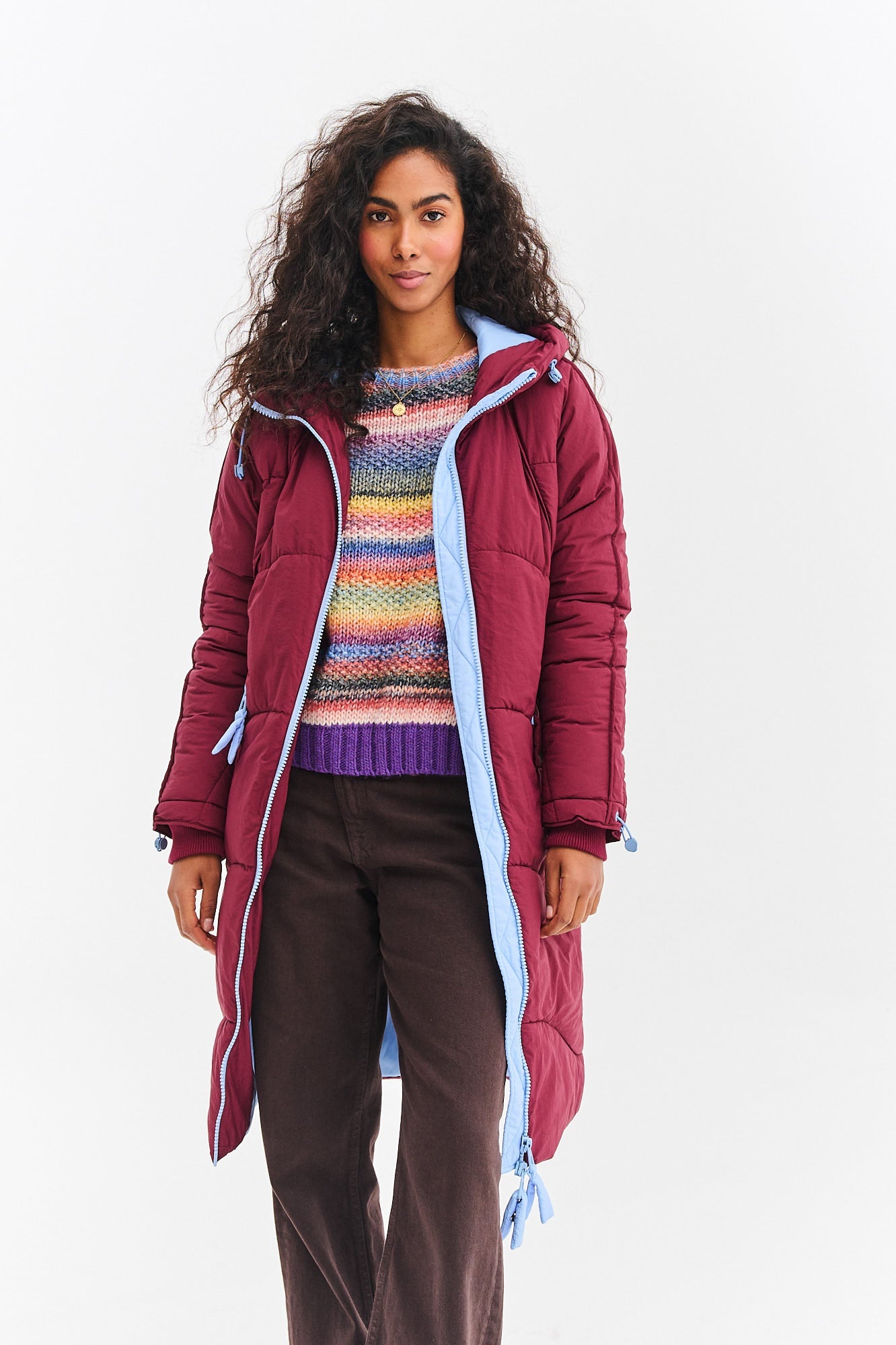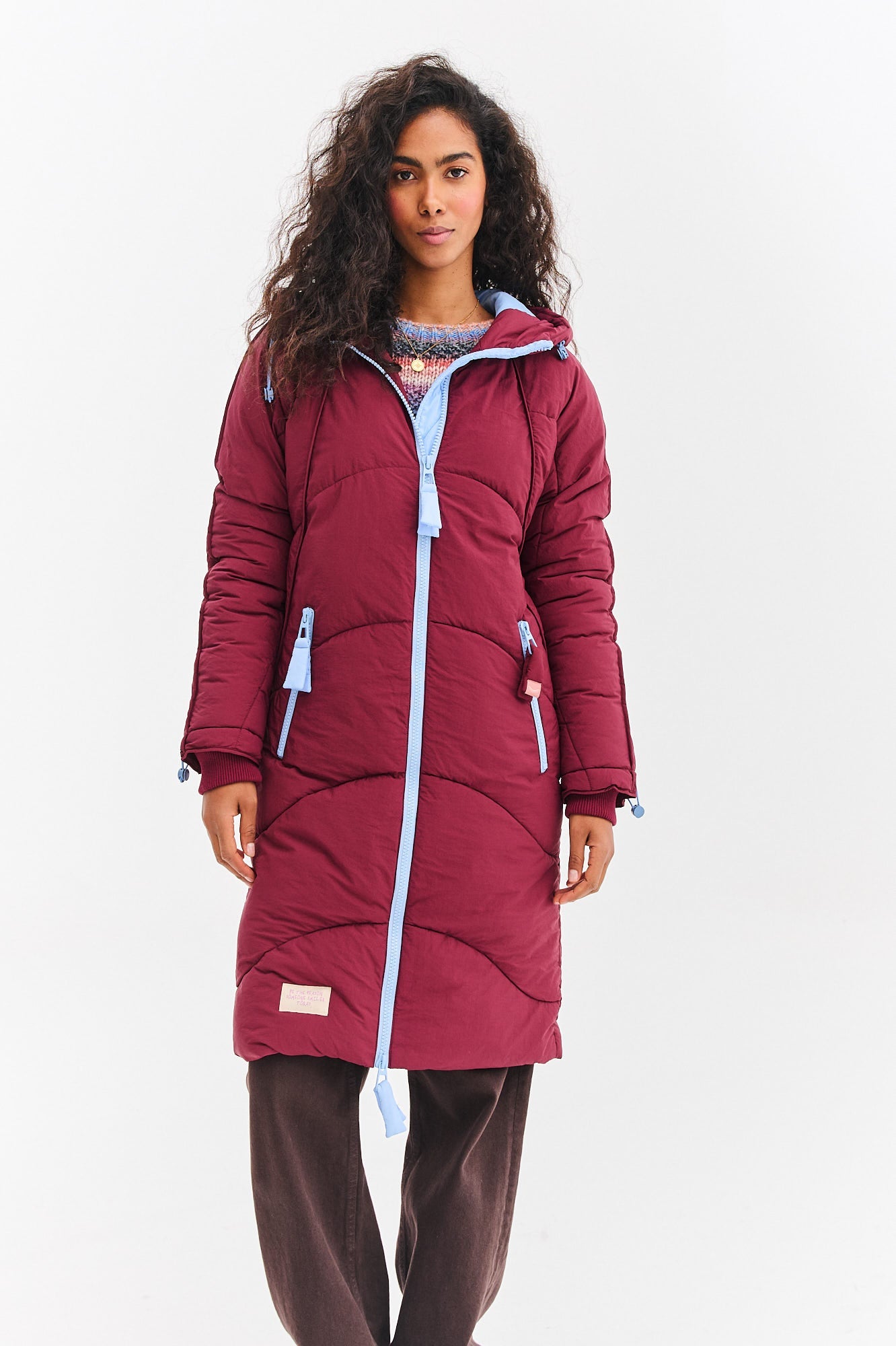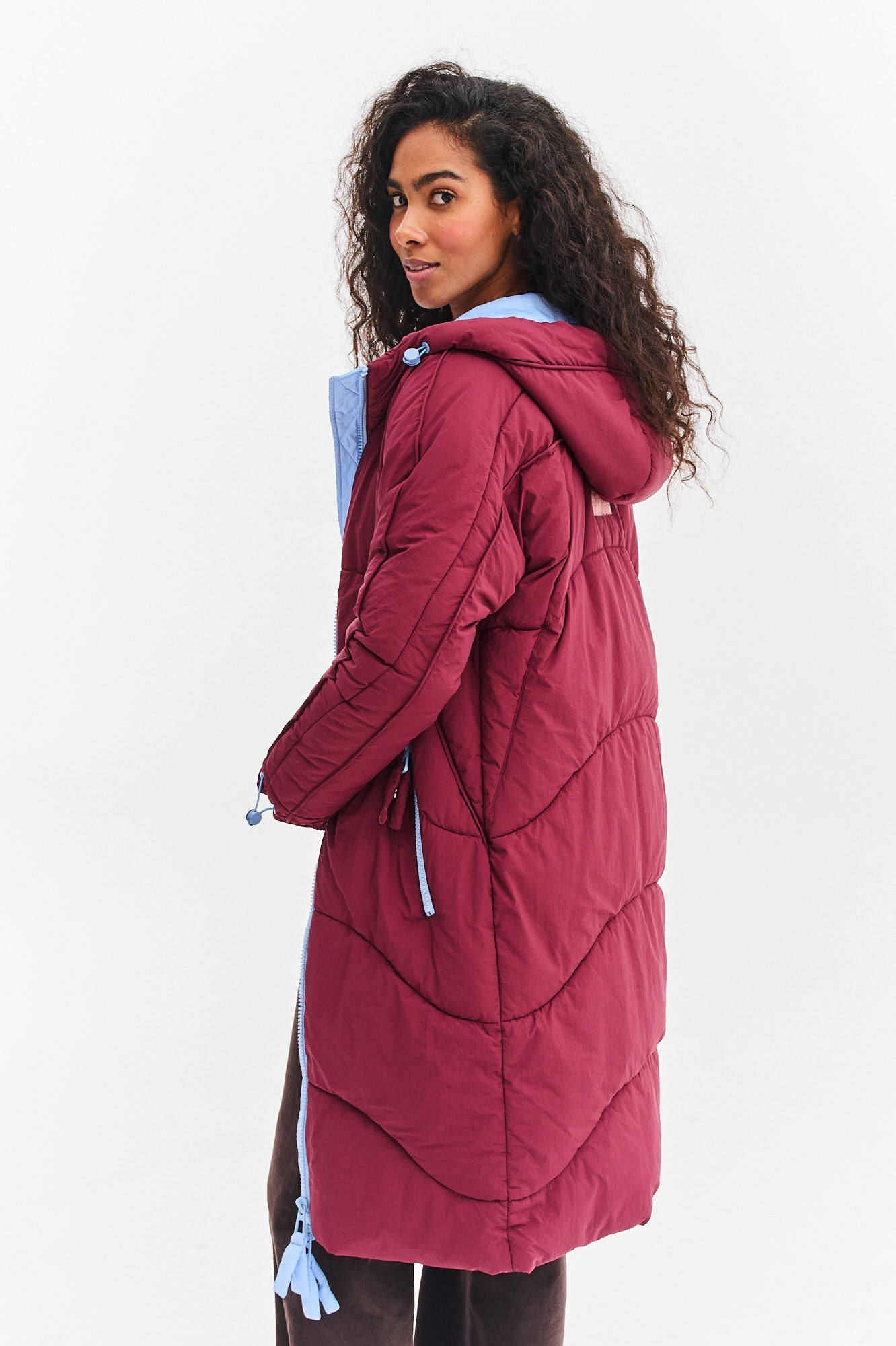 Montreal Skyline Rouge dlouhá zimní bunda kombinuje eleganci a sportovní ležérnost. Její sytě vínová barva je velmi výrazná a světle modrá podšívka kapuce je zajímavým kontrastním detailem. Jemné, vlnité prošívání přidává na lehkosti a ženském charakteru.