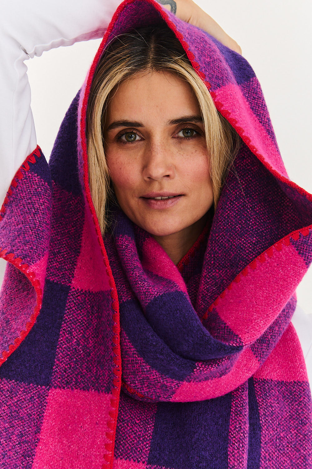 Nordic Fire checkered scarf is an accessory that cannot be passed by indifferently. The energetic combination of fuchsia and purple in a classic large check pattern catches the eye and adds energy to any, even the simplest styling.