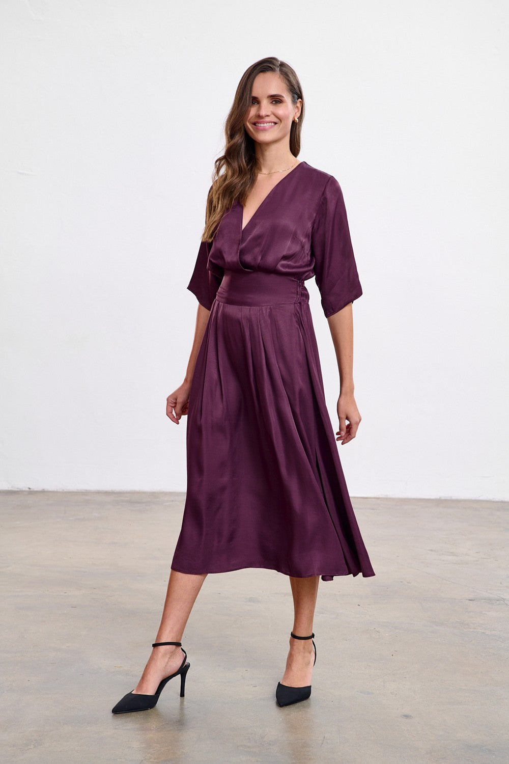 Midi šaty Plum Affair okouzlí svým královským minimalismem. Monochromatická bordó/švestková barva je neuvěřitelně lichotivá a elegantní. Zavinutý top se sklady a švem v pase tvaruje siluetu, zatímco rozšířená sukně dodává každému kroku lehkost.