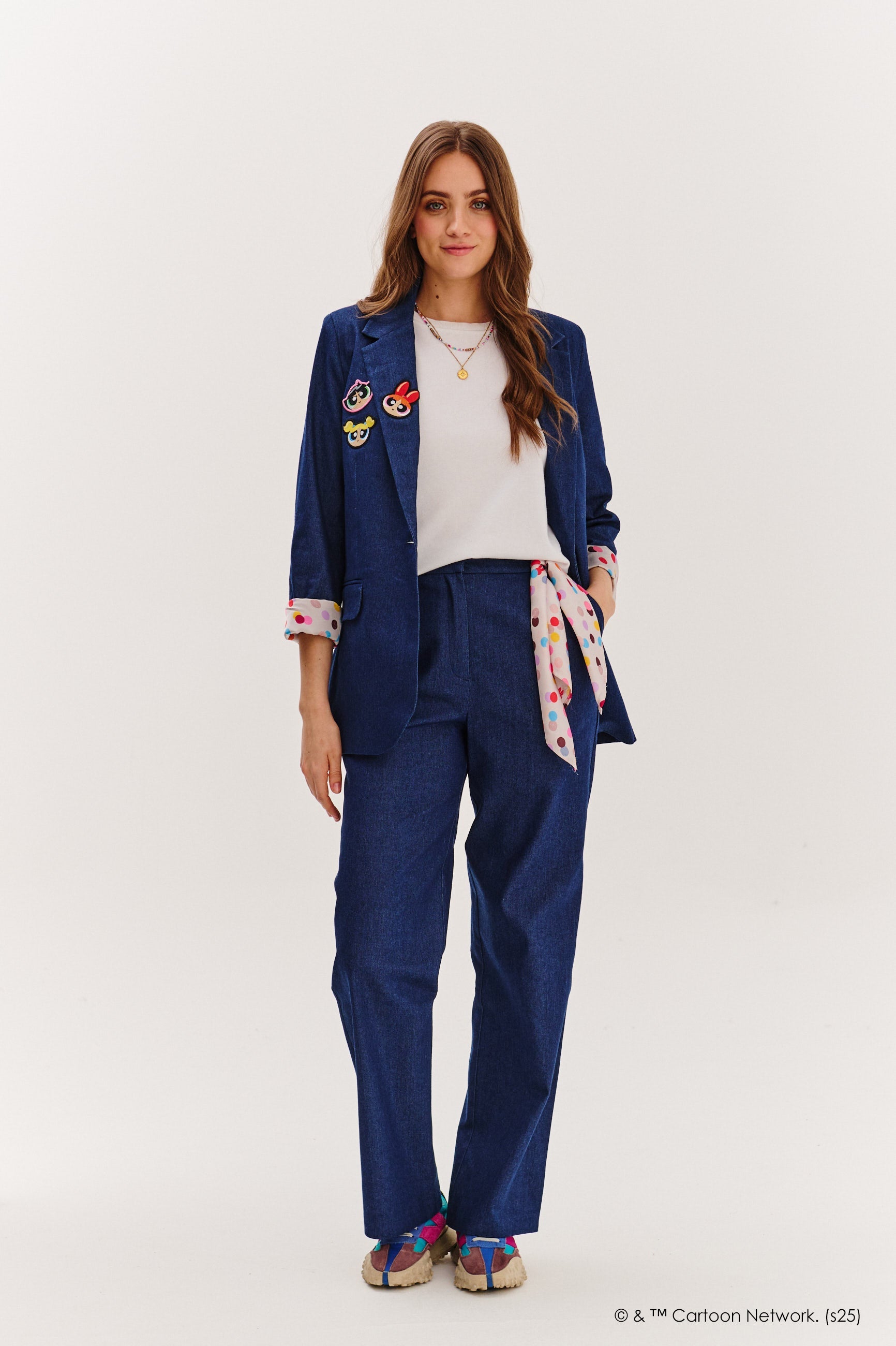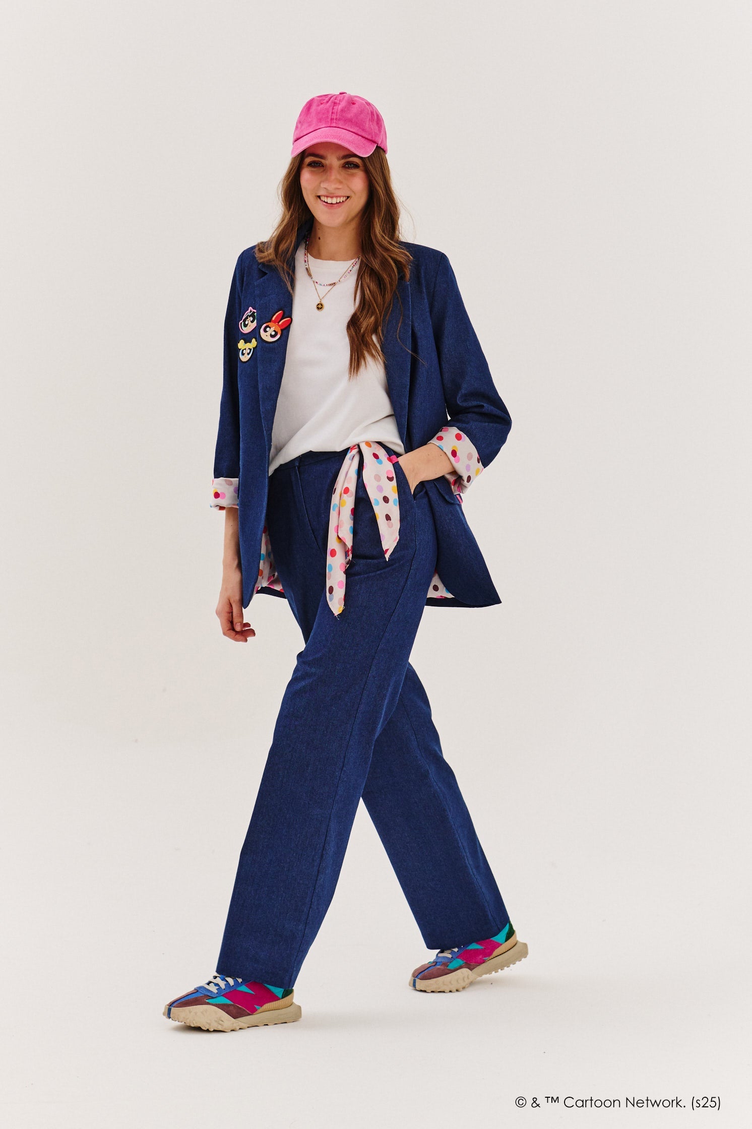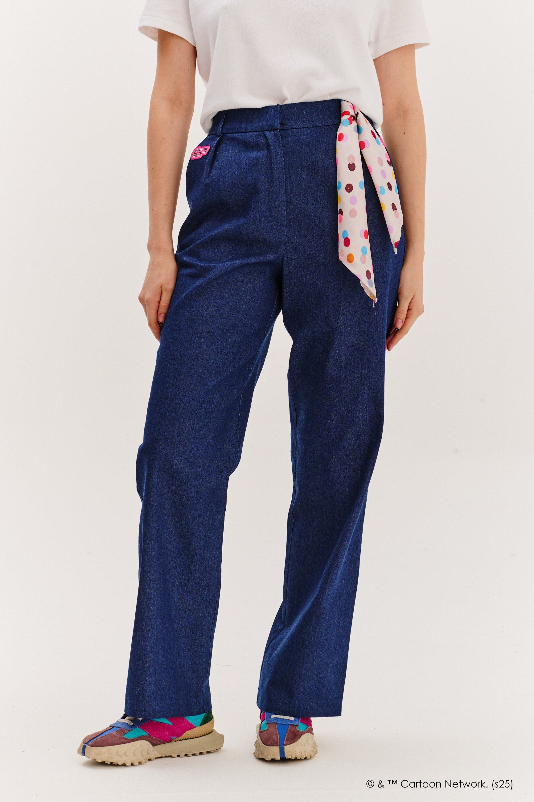 Široké džínové kalhoty Powerpuff Girls spojují nadčasový střih se silou energie! Tmavě modré džíny v klasickém širokém střihu zeštíhlují postavu, zatímco kontrastní pásek s barevným potiskem inspirovaným Powerpuff Girls dodává odvážný nádech.