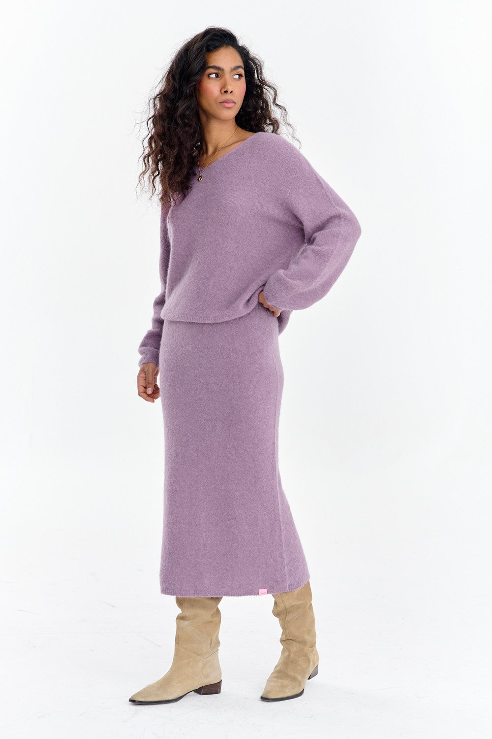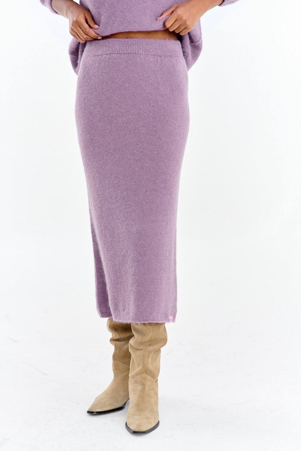 Pletená sukně Pure Poetry je dokonalým základem pro romantické i ležérní outfity. Její pouzdrový střih krásně zvýrazní postavu, zatímco pružný, žebrovaný materiál zajišťuje naprostou volnost pohybu. Jemná, melírovaně lila barva se skvěle kombinuje s béžovou, šedou i bílou.