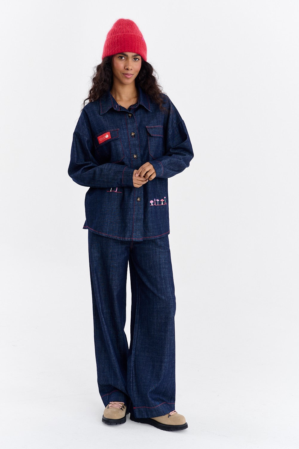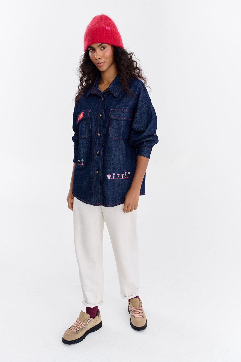 Kontrastní červené prošití dodává této košili charakter a krásně zvýrazňuje její střih – od límečku až po kapsy. Nenápadná, barevná výšivka na lemu a červený nášivka na kapse jsou detaily, které přidávají špetku kouzla. Noste ji zapnutou nebo volně přehozenou přes top.