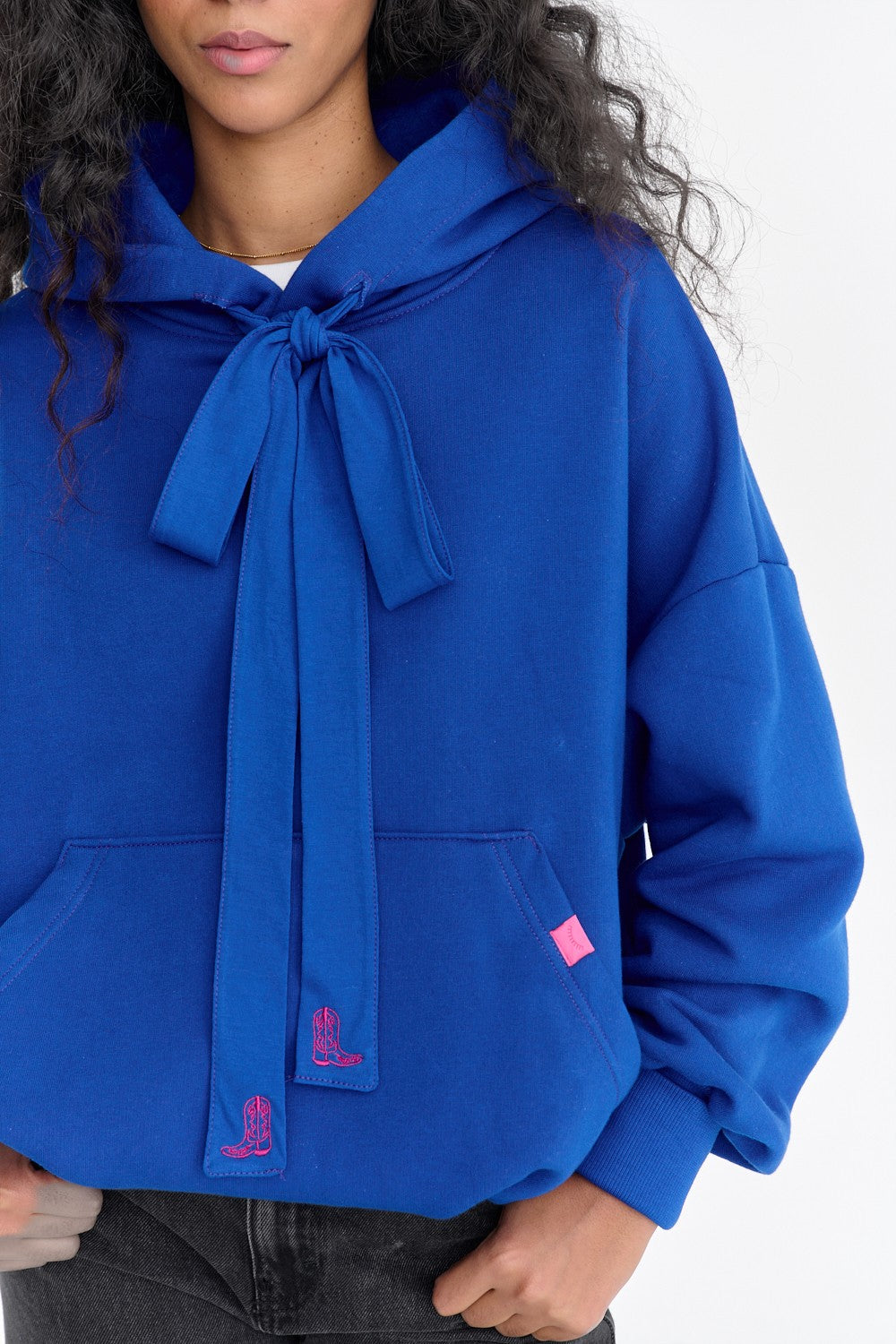 Mikina Rodeo Kiss je definicí pohodlí v odvážné barvě. Její energický modrý odstín okamžitě oživí každý outfit. To, co ji odlišuje, je její volný, oversized střih a neobvyklé detaily – široké látkové šňůrky na kapuci, které si můžete uvázat do výrazné mašle.