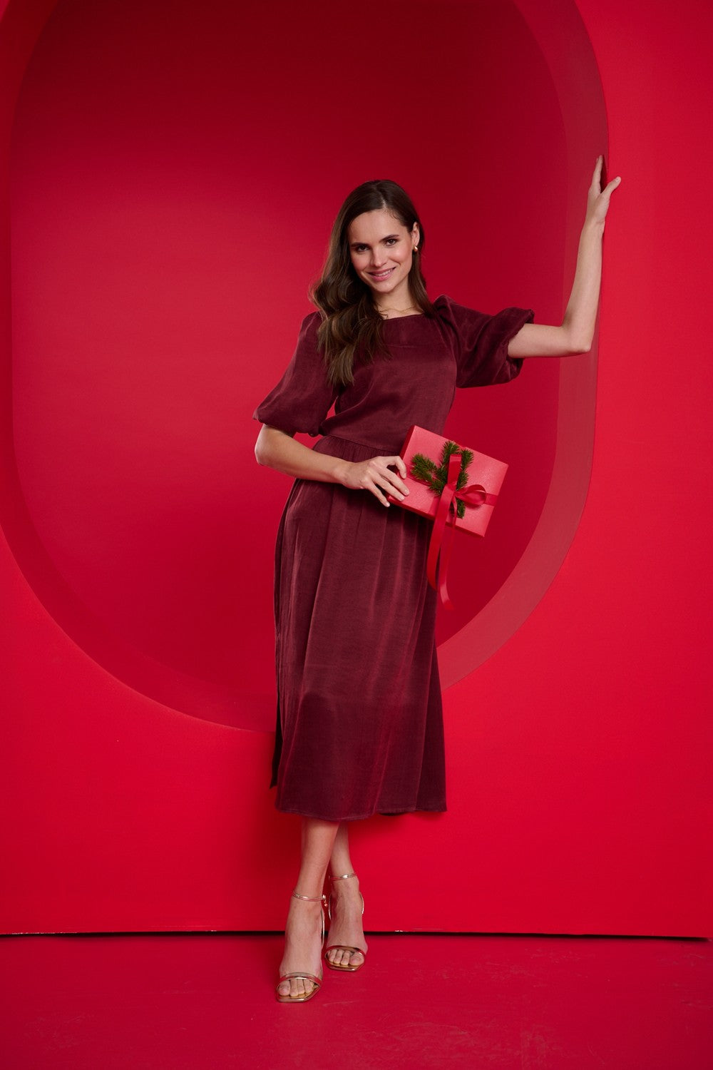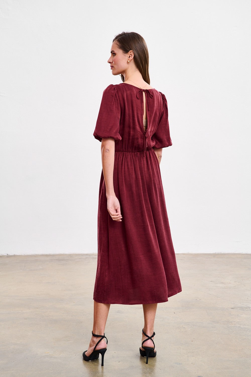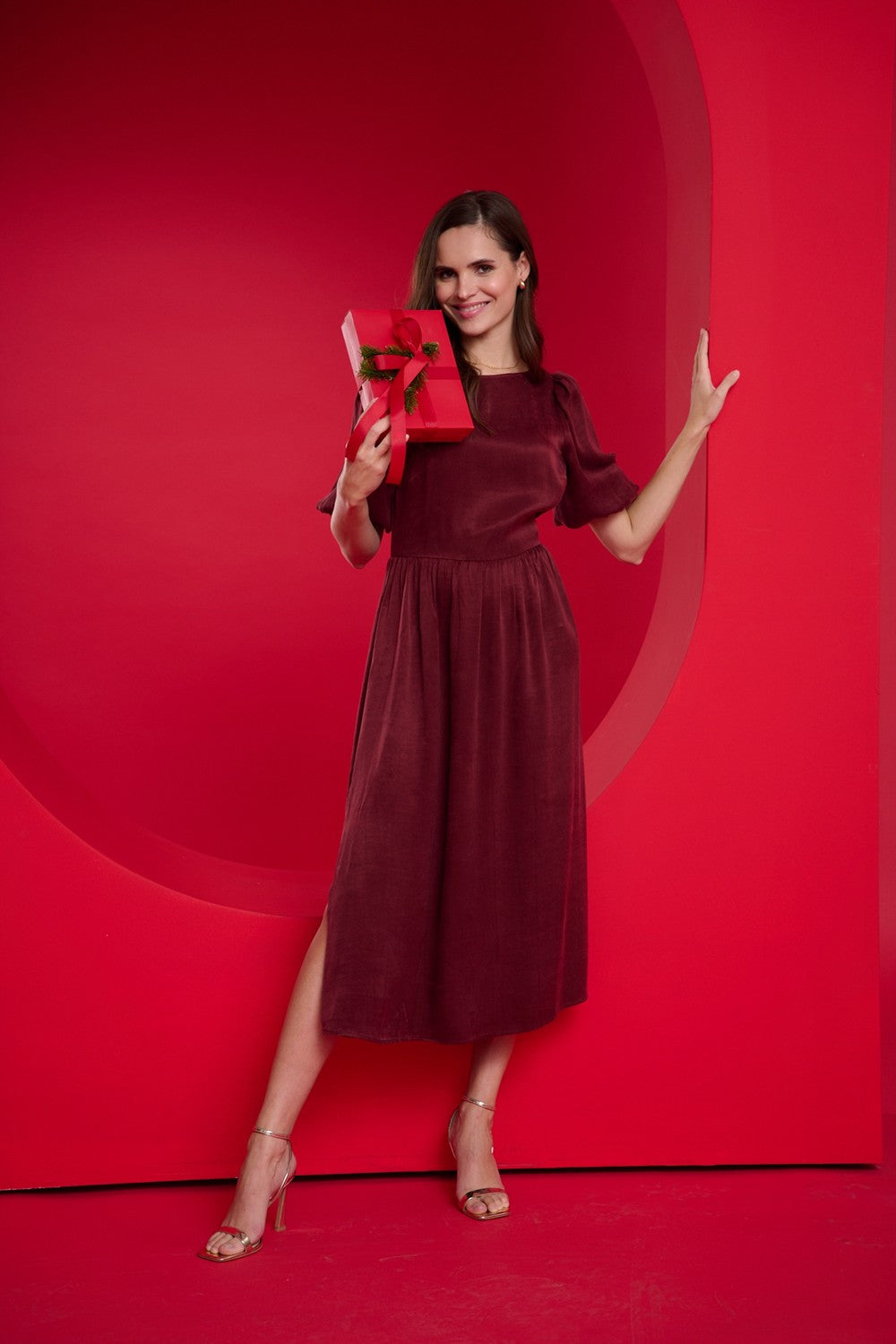 Midi šaty Ruby Rose přitahují pozornost svým sytým odstínem tmavě červené. Přiléhavý top a mírně rozšířená sukně dokonale vyvažují proporce siluety. Nafouklé rukávy a výrazný výstřih na zádech, který jemně odhaluje kůži, dodávají šatům půvab.