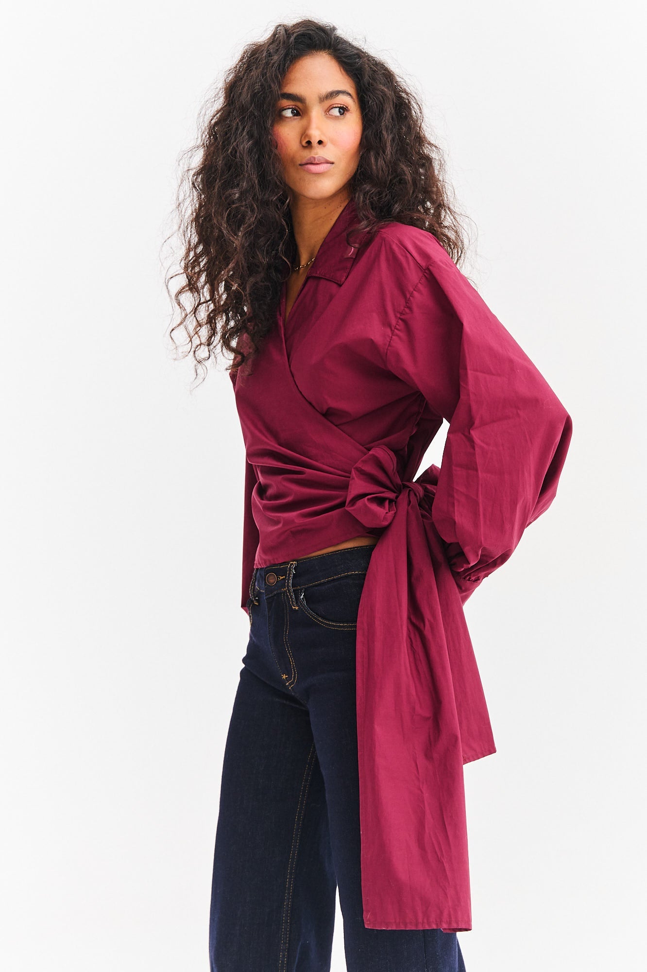 Košile Shape of Her tie je ztělesněním ženskosti. Její zavinovací střih krásně tvaruje siluetu, zatímco široký pásek umožňuje dokonalé přizpůsobení a zdůrazňuje pas. Nafouklé rukávy zakončené manžetami dodávají romantický nádech.