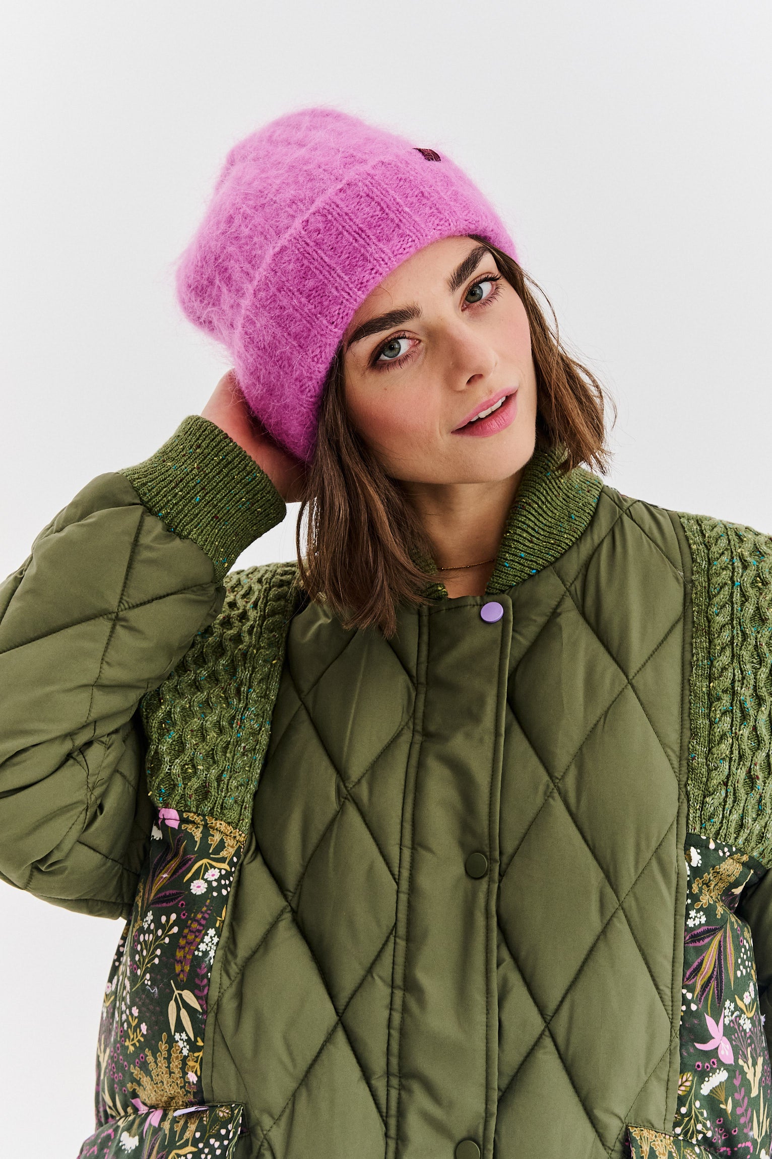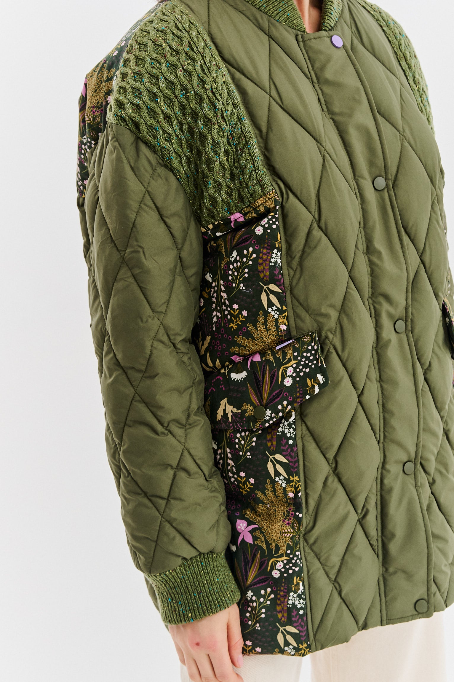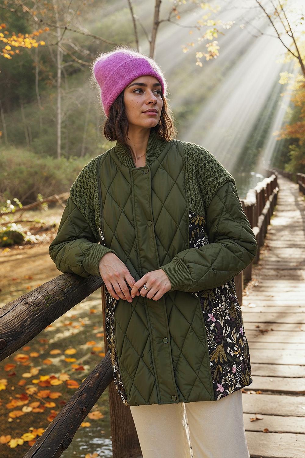 Prošívaná bunda Soft Jungle je hrou kontrastů. Klasický střih inspirovaný bomberem v khaki barvě je rozbit panely látky s jemným, botanickým vzorem "soft jungle". Diamantové prošívání dodává bundě strukturu, zatímco volný, oversized střih zajišťuje maximální pohodlí a volnost pohybu.
