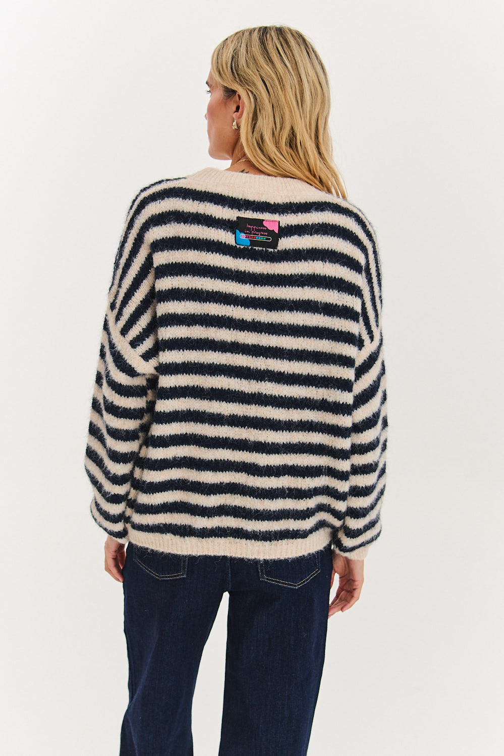 The French Tale sweater is the definition of unforced elegance. It is a nod to French style. The combination of a cream base with navy blue stripes is timeless and goes with everything.