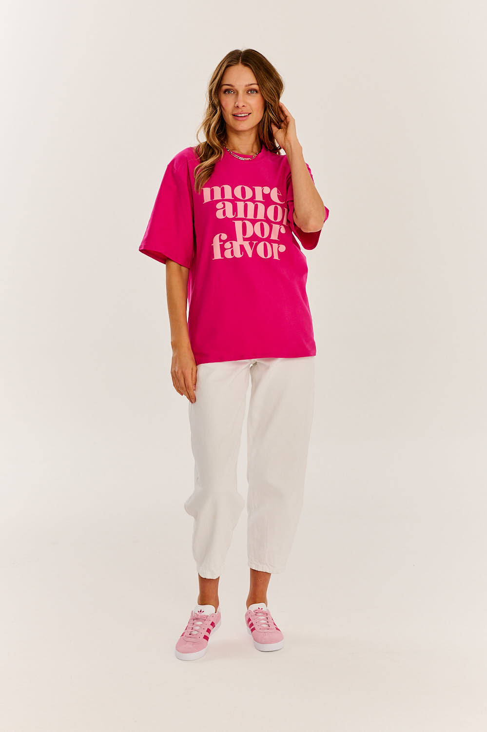 Amor T-shirt je ztělesněním letní energie a radosti. Její intenzivní odstín připomíná letní západy slunce u moře a dodává každému outfitu zářivou atmosféru. Na tričku vyniká inspirativní nápis 'More amor por favor', který nám připomíná důležitost lásky a empatie v každodenním životě. Pohledy budou směřovat na vás, což ještě více rozesměje kolemjdoucí.
