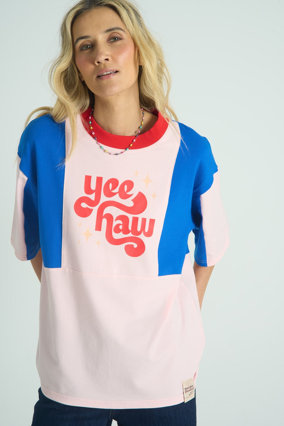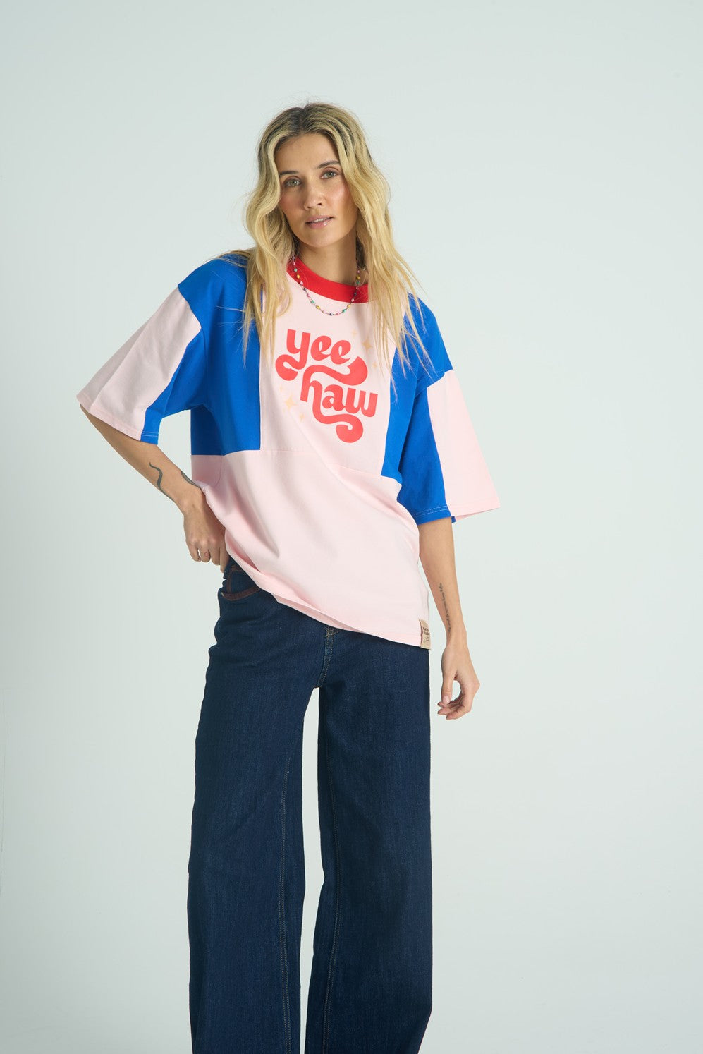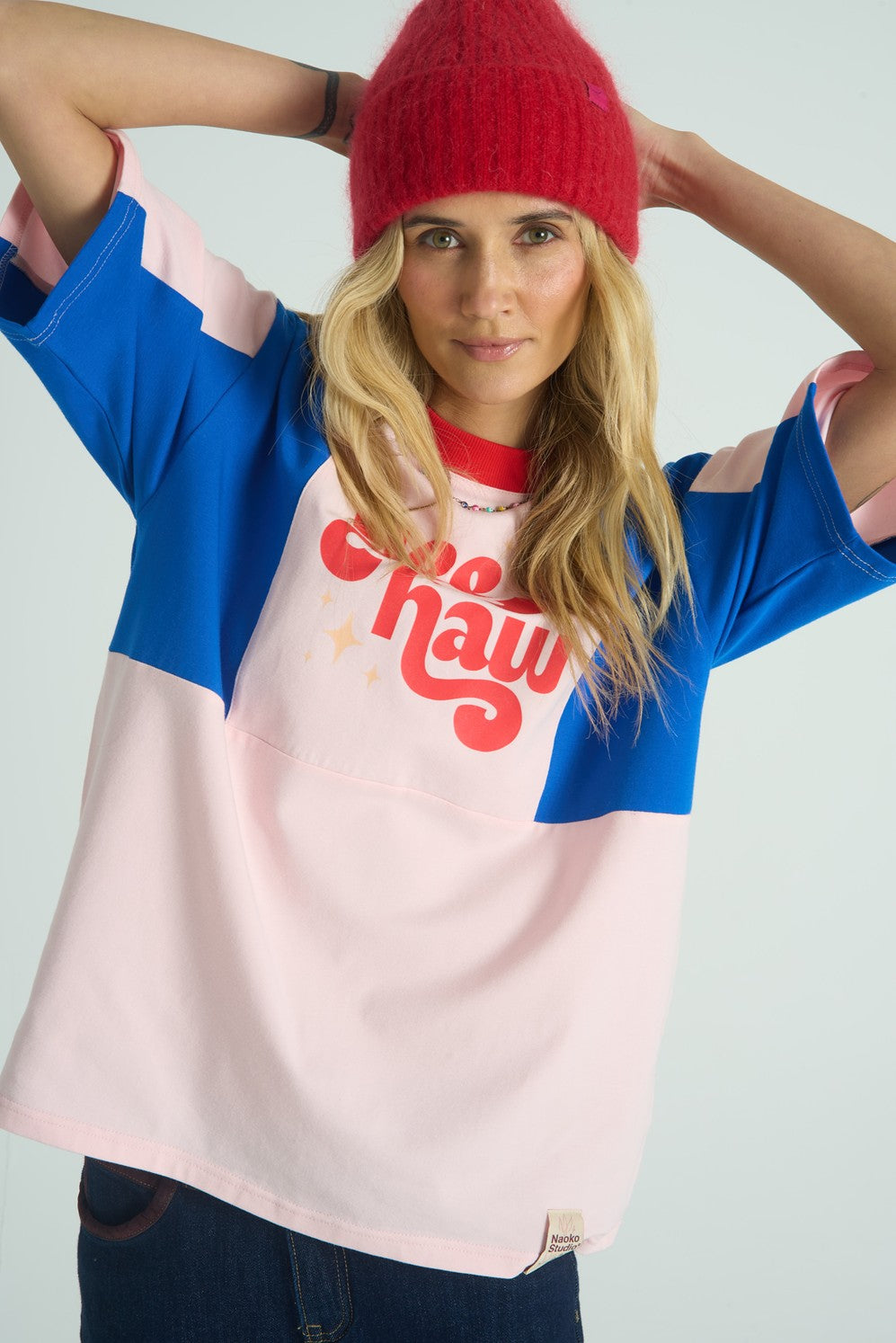 Tričko Yee Haw x Jessica Molina je jedinečnou kombinací Divokého západu a umělecké citlivosti, vytvořenou v rámci projektu Naoko x Artist Remix. Pastelově růžové tělo kontrastuje s energickými modrými rukávy a červeným lemem, což vytváří dokonalé pozadí pro umění. Na přední straně najdete veselou, retro typografii, zatímco zadní část zdobí fascinující ilustrace od Jessicy Moliny – plná ohně, magie a ženského tajemství.