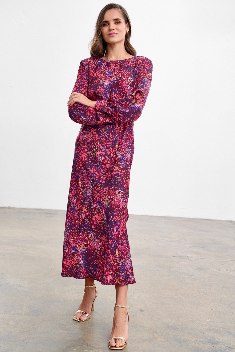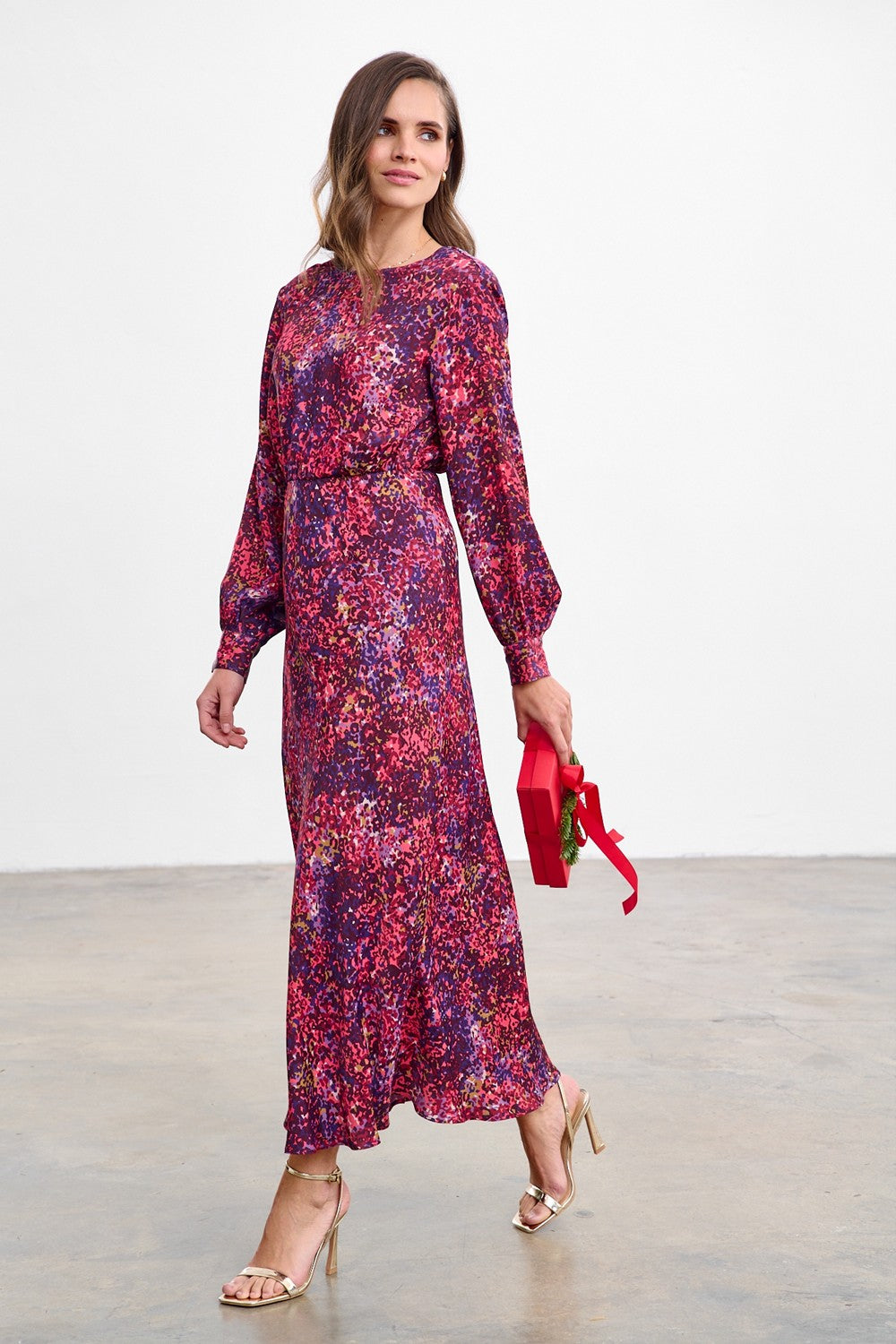 Take A Chance dlouhé šaty jsou styl pro ženy, které rády poutají pozornost. Abstraktní potisk v sytých odstínech fuchsiové a fialové na viskózové látce vytváří energický celek. Zavinutý výstřih do V a dlouhé rukávy s elastickými manžetami vyvažují proporce a maxi délka opticky prodlužuje postavu.