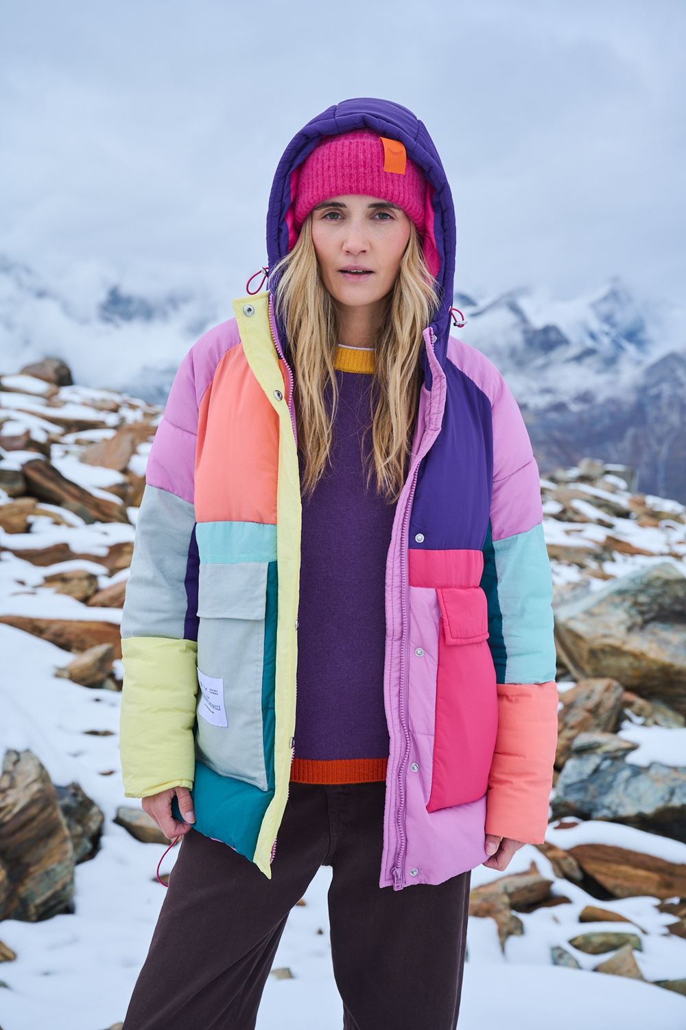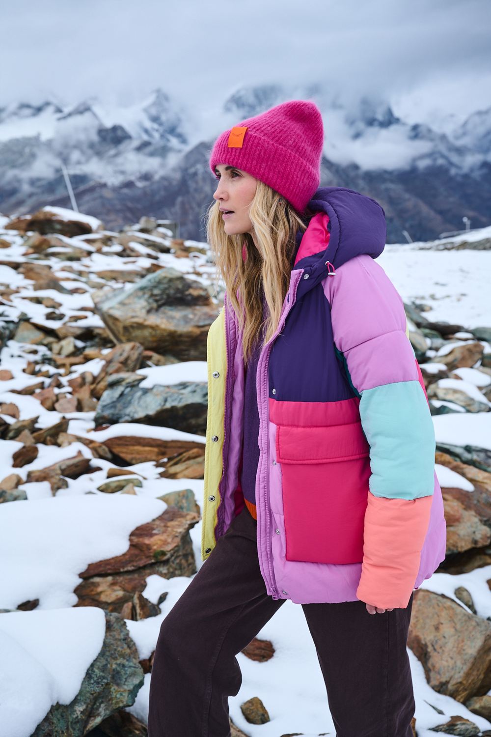 Tromso Colorblock zimní bunda je model vytvořený pro dobrodružné a nekonvenční milovníky stylu. Inspirována barvami polární záře, vyznačuje se výraznými barevnými bloky, které kombinují odstíny fialové, růžové, zelené, šedé a žluté. Je to perfektní volba pro zimní dny, kdy chcete spojit funkčnost s jedinečným designem.