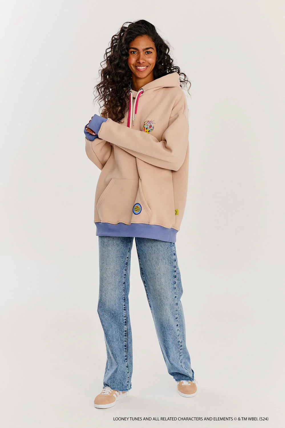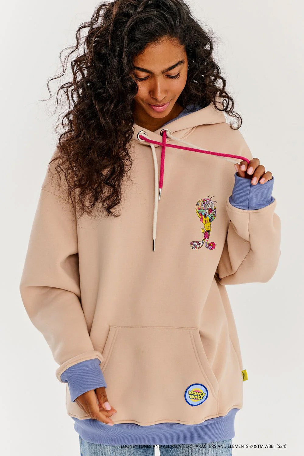 Mikina Tweety Colors je návratem do dětství, kdy postavičky z ikonického seriálu zaplňovaly obrazovku svým jedinečným kouzlem. Jemná barva mikiny spolu s potisky Tweetyho obrázku nám okamžitě připomíná sladké vzpomínky na dětství.