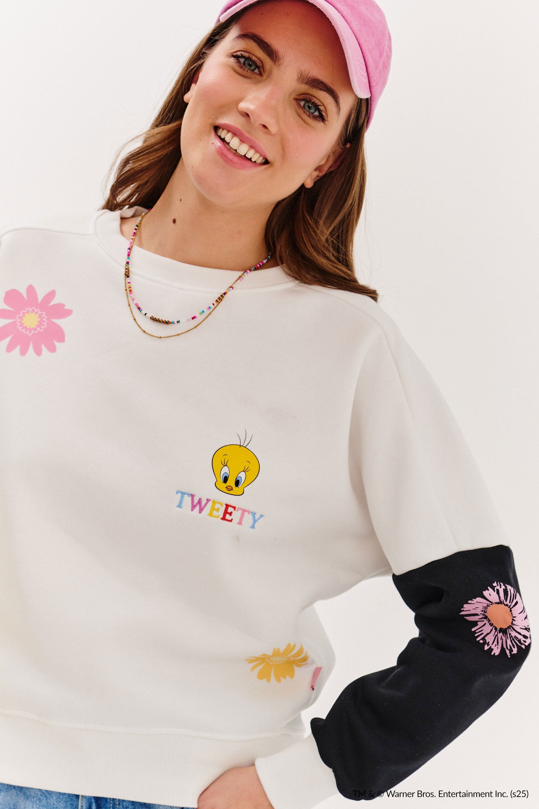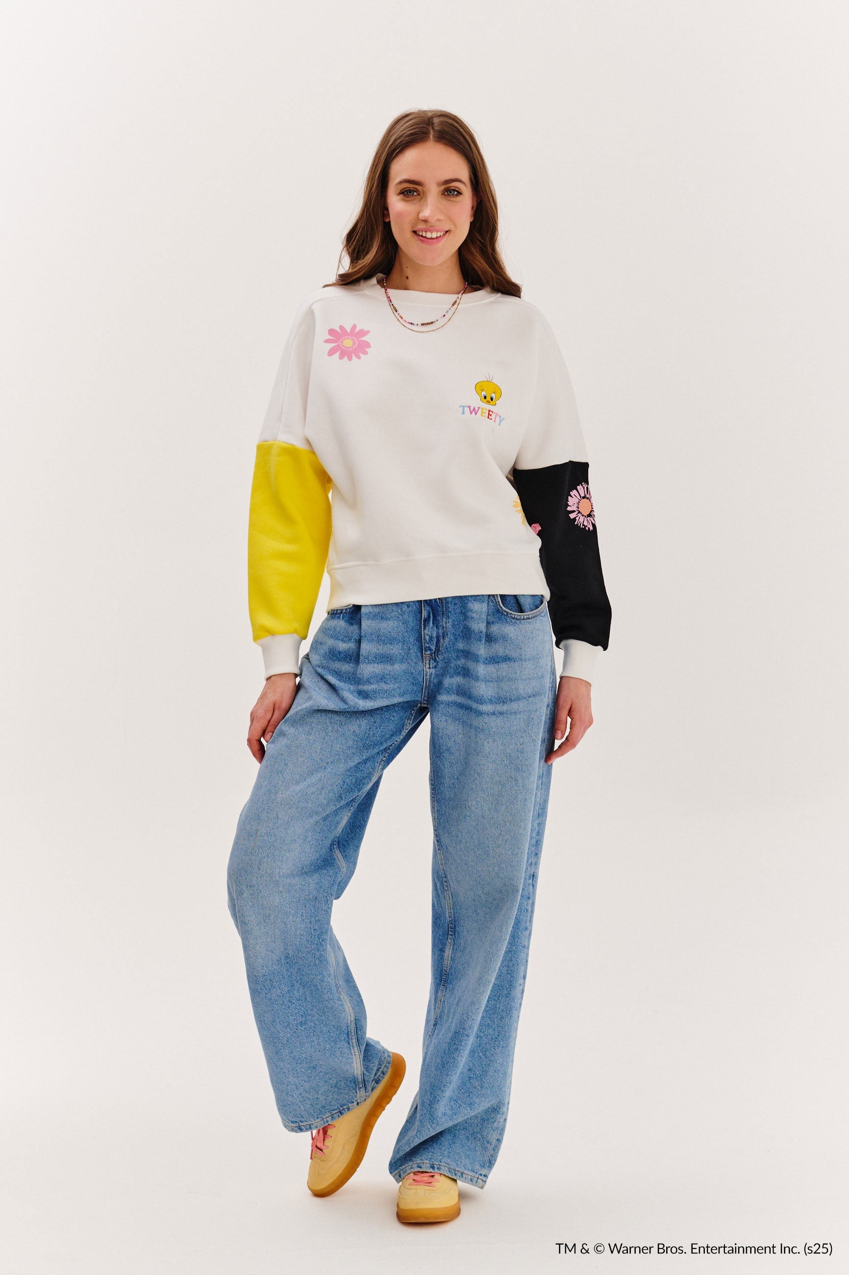 Mikina Tweety in Bloom je esencí jarní veselosti s nádechem nostalgie! Na přední straně najdete roztomilého Tweetyho mezi barevnými květinami a pastelovým nápisem „TWEETY“, který rozjasní každý den. Rukávy ve dvou kontrastních barvách – slunečně žluté a tmavě grafitové – dodávají mikině energii a moderní nádech.