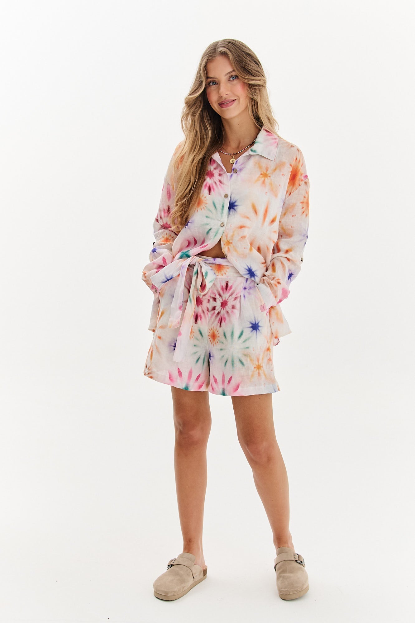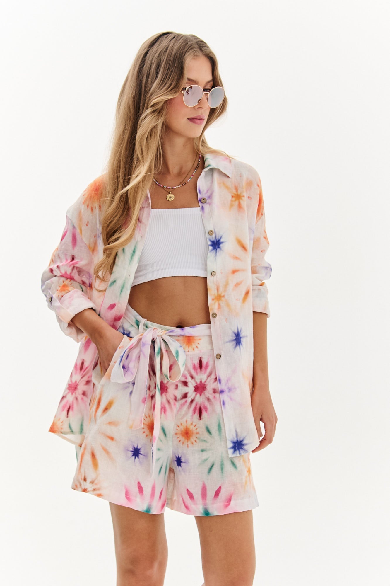 Lněná košile Vibe Ride je ideální volbou pro ženy, které chtějí do svého šatníku vnést dávku energie a nenucené lehkosti. Je vyrobena z lehkého potištěného lnu a okouzlí výrazným designem rozmazaných barevných explozí, které evokují radostné letní dny. Její volný, krabicový střih a 3/4 rukávy zajišťují celodenní pohodlí, zatímco kokosové knoflíky dodávají nádech přírodní elegance.