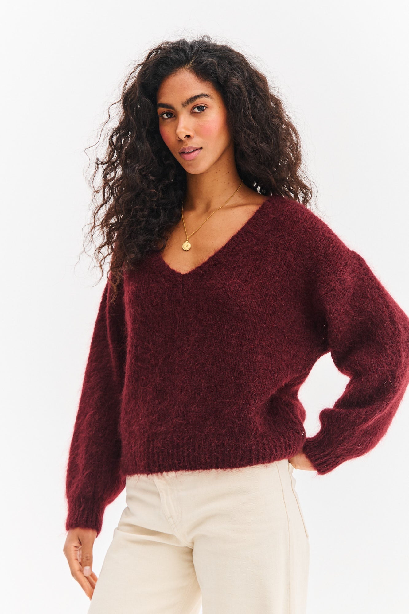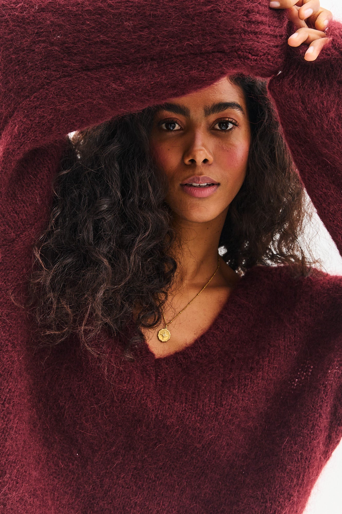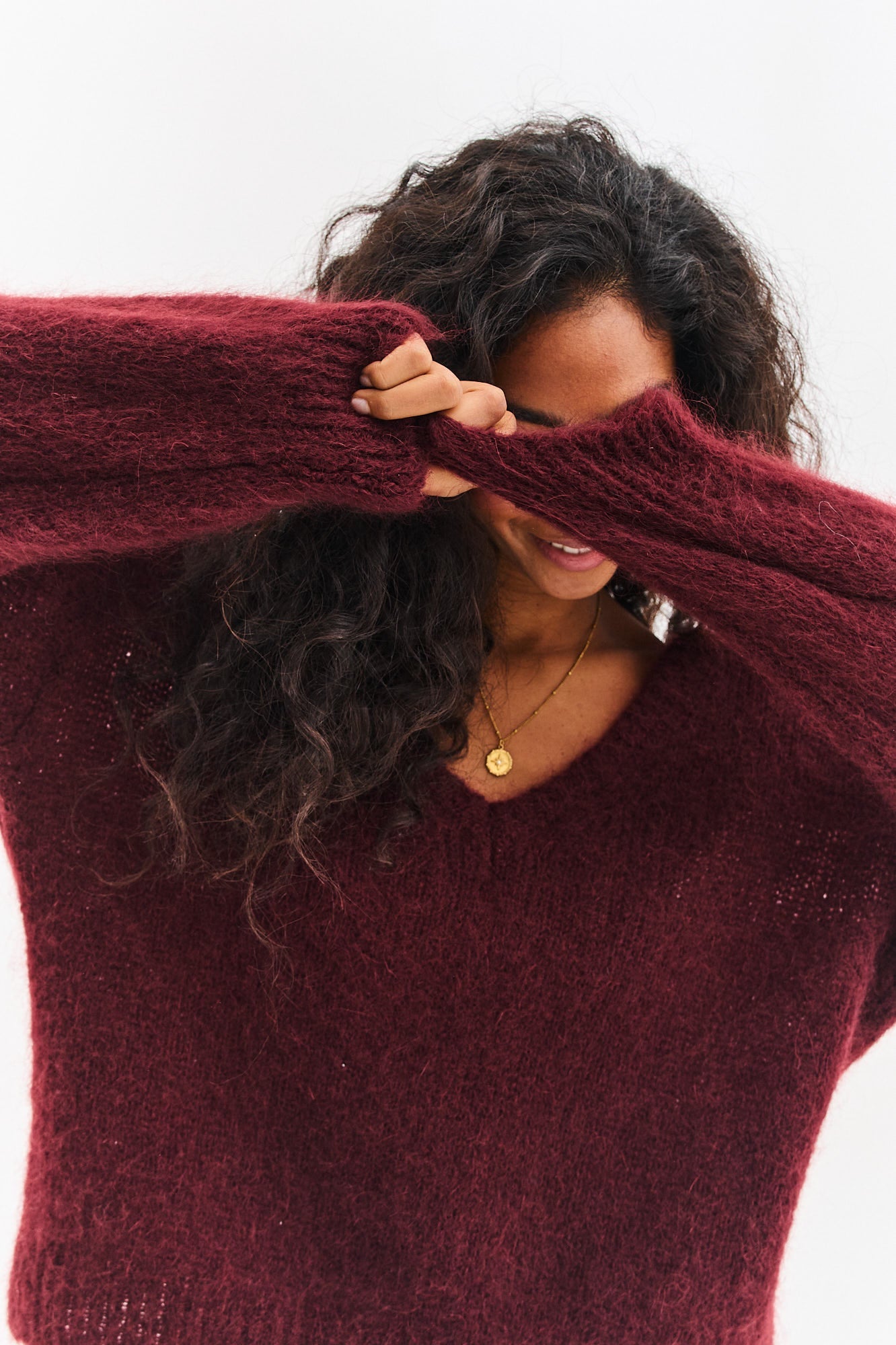 Berrylicious Wollpullover ist der Inbegriff von herbstlichem Komfort und Eleganz. Gefertigt aus einer hochwertigen Mischung mit Mohair, ist er extrem weich und angenehm auf der Haut. Die tief burgunderrote Farbe, inspiriert von reifen Waldfrüchten, verleiht jedem Outfit Klasse.