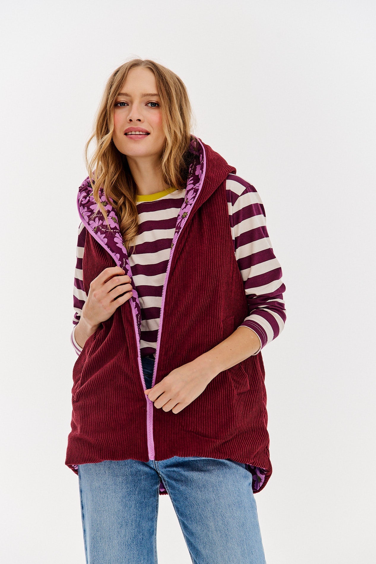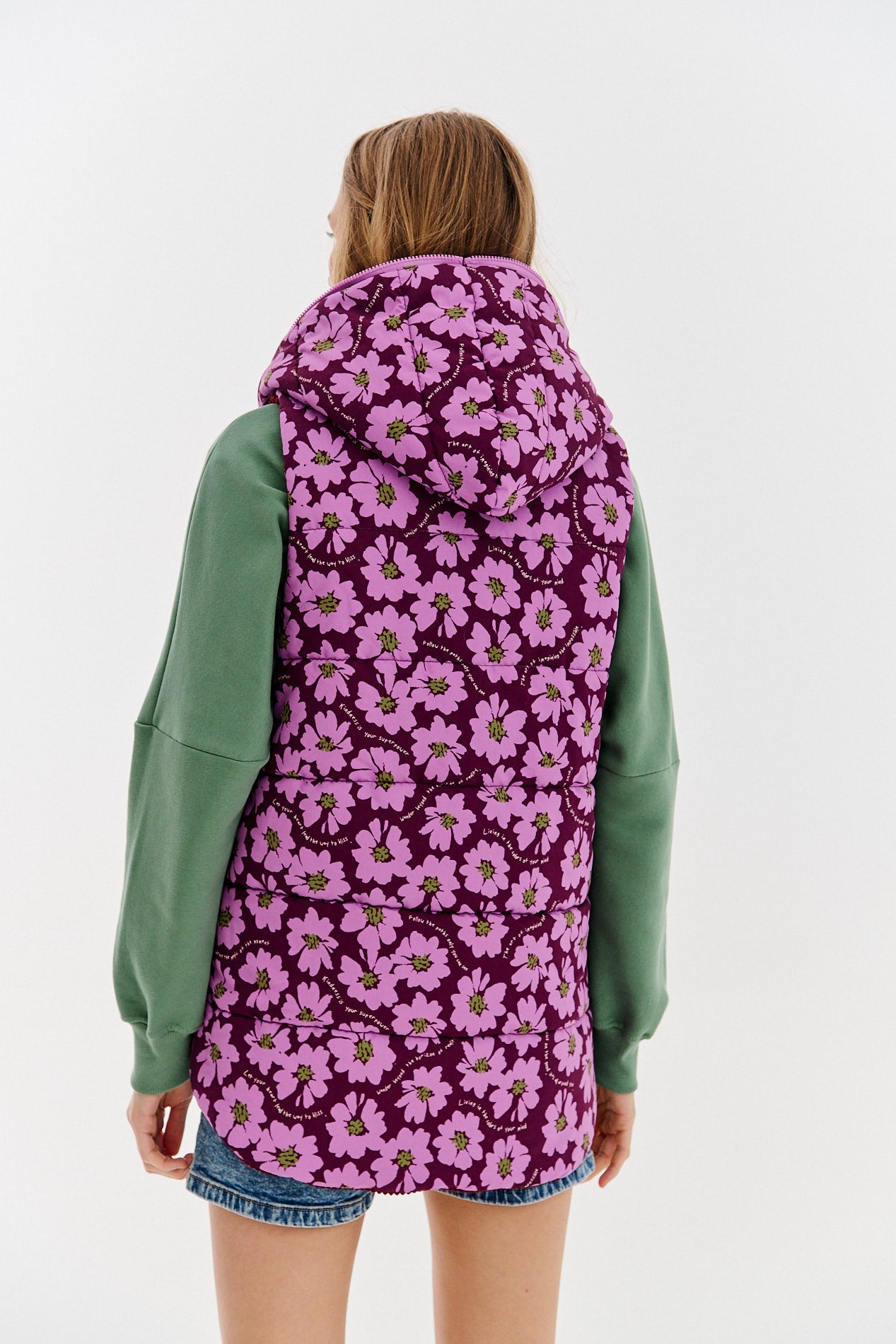 Bloomy Balance Wendeweste ist für diejenigen entworfen, die gerne mit Mode spielen und eine perfekte Harmonie zwischen klassischem Stil und femininer Energie suchen. Auf der einen Seite zeigt sie einen lebendigen Blumenprint in Rosa- und Lilatönen, der garantiert die Stimmung hebt und alle Blicke auf sich zieht; auf der anderen Seite eine gesteppte, tief bordeauxrote Oberfläche mit dezenten Details für einen zurückhaltenderen Look. Leicht, aber dennoch warm – perfekt für morgendliche Spaziergänge, Erledigungen in der Stadt oder spontane Wochenendausflüge.