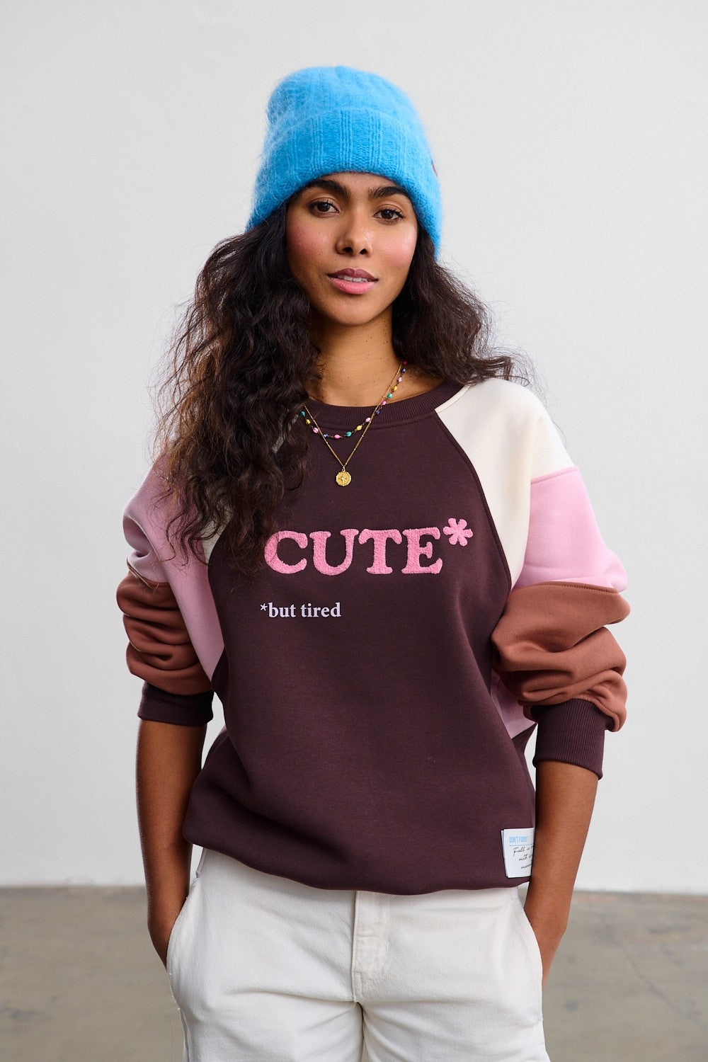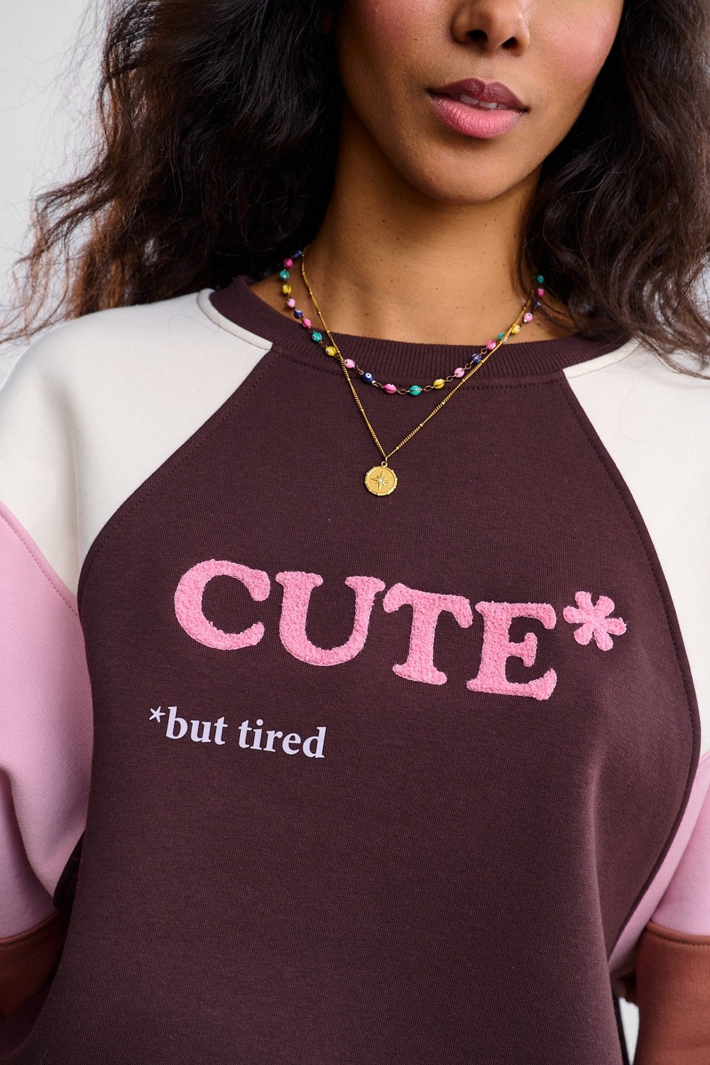 Das Cute But Tired Sweatshirt ist ein humorvoller Akzent für Ihre Garderobe, der die Realitäten des modernen Lebens perfekt widerspiegelt. Der oversized Raglan-Schnitt kombiniert drei Farben: Schokoladenbraun, Puderrosa und Cremeweiß und erzeugt so einen modischen Color-Blocking-Effekt.