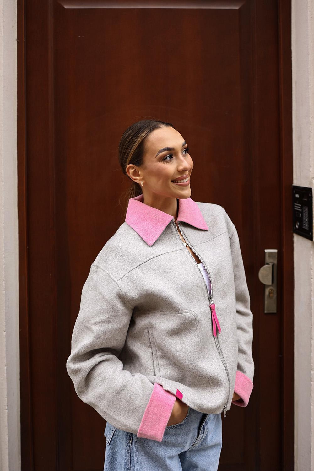 Candy Glow Jacke vereint Minimalismus mit einem energetischen Akzent, der sofort die Stimmung hebt. Die dezente graue Basis wird durch pinke Details – den Kragen, die Bündchen und das Futter – aufgelockert und verleiht dem gesamten Stück eine leichte, mädchenhafte Note. Der schlichte, kastenförmige Schnitt mit praktischem Reißverschluss und großen Taschen macht sie zum perfekten Alltagsstück.