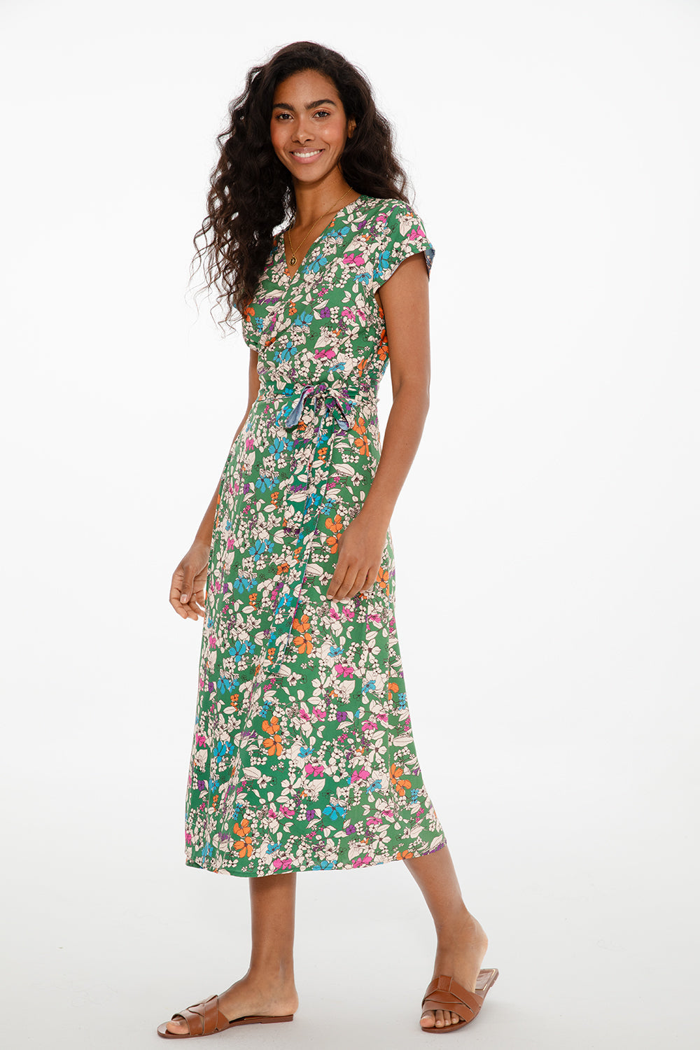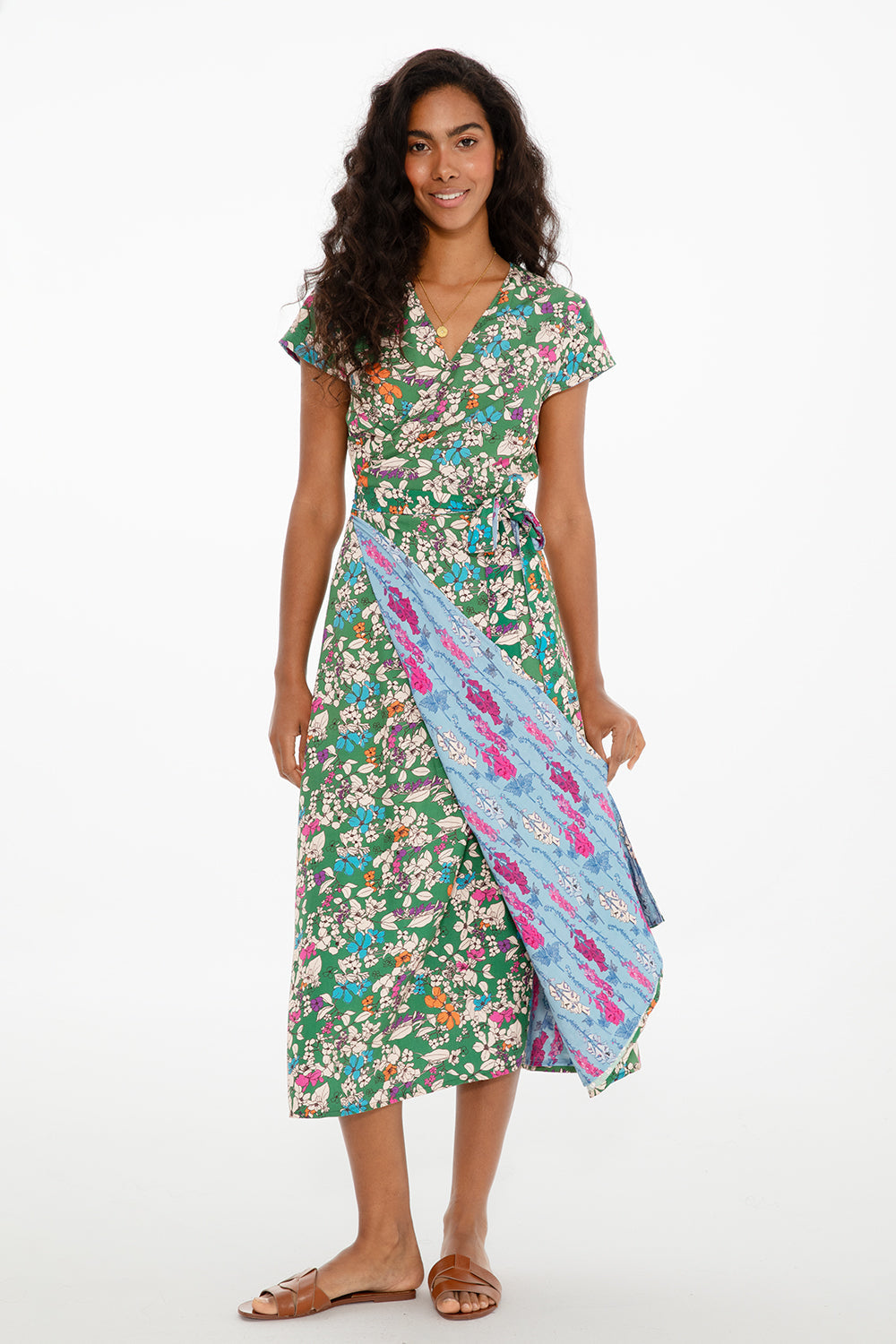 Chameleon Giulia wendbares Kleid ist eine Feier weiblicher Vielseitigkeit und Kreativität. Dieses Modell lässt Sie wählen, welche Version Ihres Stils Sie heute ausdrücken möchten. Eine Seite zeigt ein lebhaftes Blumenmuster auf smaragdgrünem Hintergrund, während die andere eine subtilere Variante bietet – drehen Sie es einfach auf links für einen ganz neuen Look. Der leichte Viskosestoff macht es atmungsaktiv und perfekt für Sommertage.