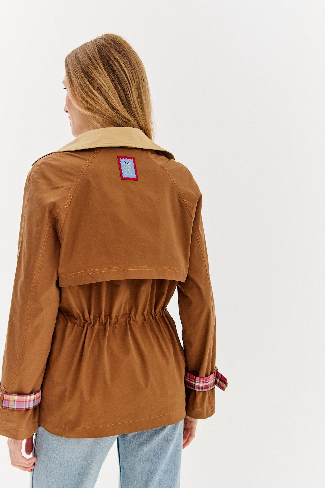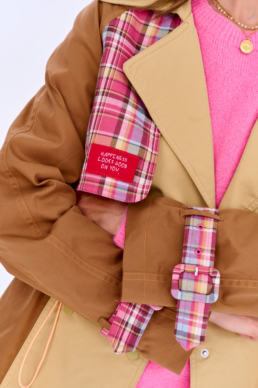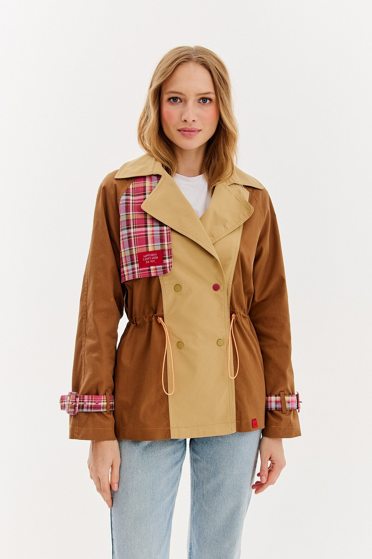 Coffee Break Kurzer Trenchcoat ist eine Hommage an den klassischen Stil mit einem verspielten, farbenfrohen Twist. Die warmen Beigetöne werden durch ein energiegeladenes rotes Karomuster und ein pinkfarbenes Innenfutter aufgelockert, was dem Ganzen einen einzigartigen Charakter verleiht. Es ist ein Vorschlag für Frauen, die zeitlose Eleganz schätzen, aber gerne ein wenig ihrer eigenen Persönlichkeit einbringen. Der lockere Schnitt, die Taillenkordel und die hüftlange Passform machen ihn zu einer vielseitigen und bequemen Wahl für den Alltag – fürs Büro, einen Spaziergang oder einen Kaffee mit einer Freundin.