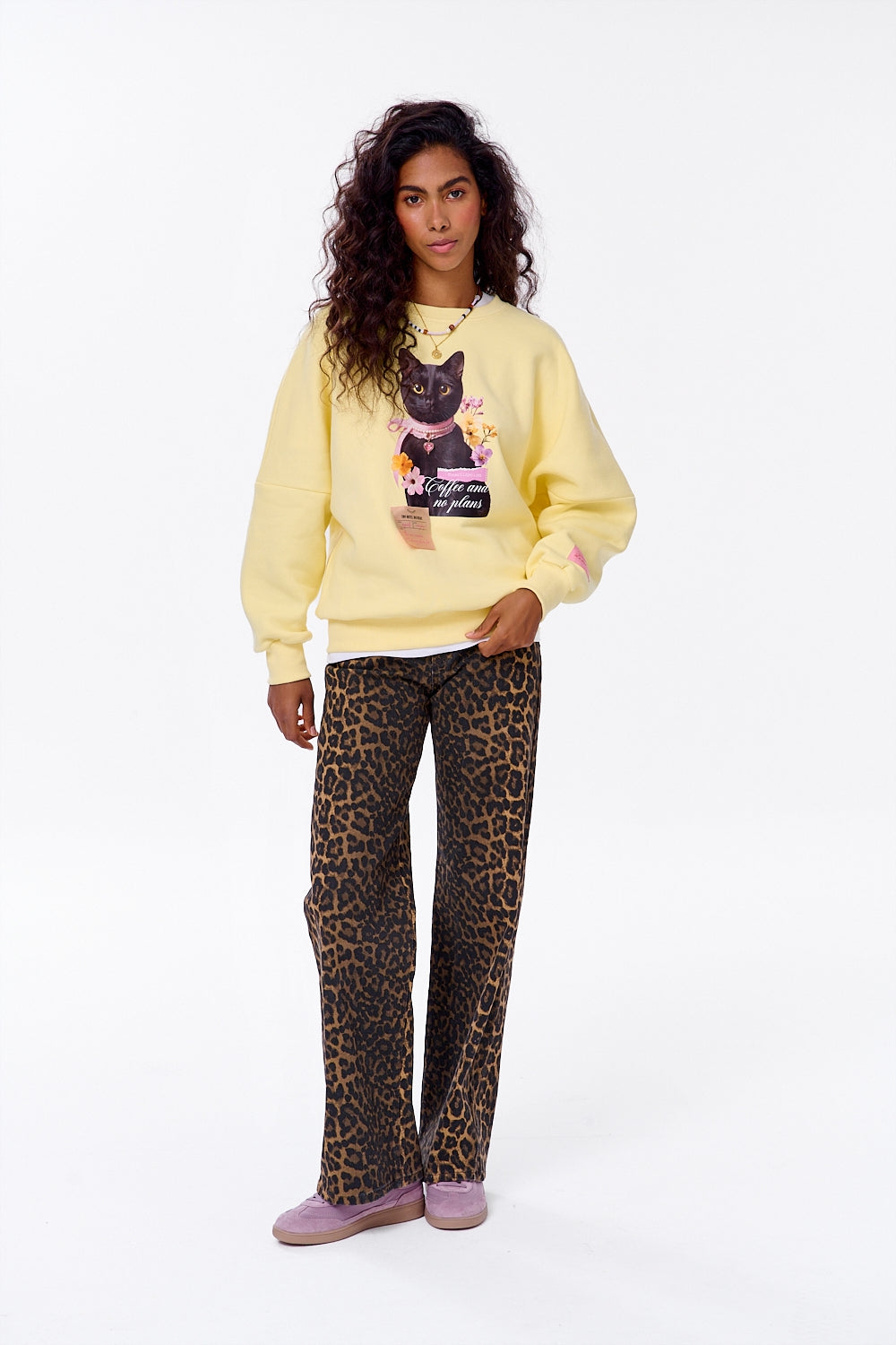 Auf der Vorderseite des Sweatshirts finden Sie einen einzigartigen Print mit einer niedlichen schwarzen Katze, die mit einer pastellfarbenen Schleife und Perlen geschmückt ist und von Blumen umgeben wird. Daneben befindet sich die Aufschrift "Coffee and no plans", die die Stimmung dieses Sweatshirts am besten einfängt – Slow Life, Entspannung und das Genießen der kleinen Dinge. Die Details vervollständigen den Look: Kontrastierende Etiketten und dezente Patches verleihen Charakter und ein einzigartiges Finish.