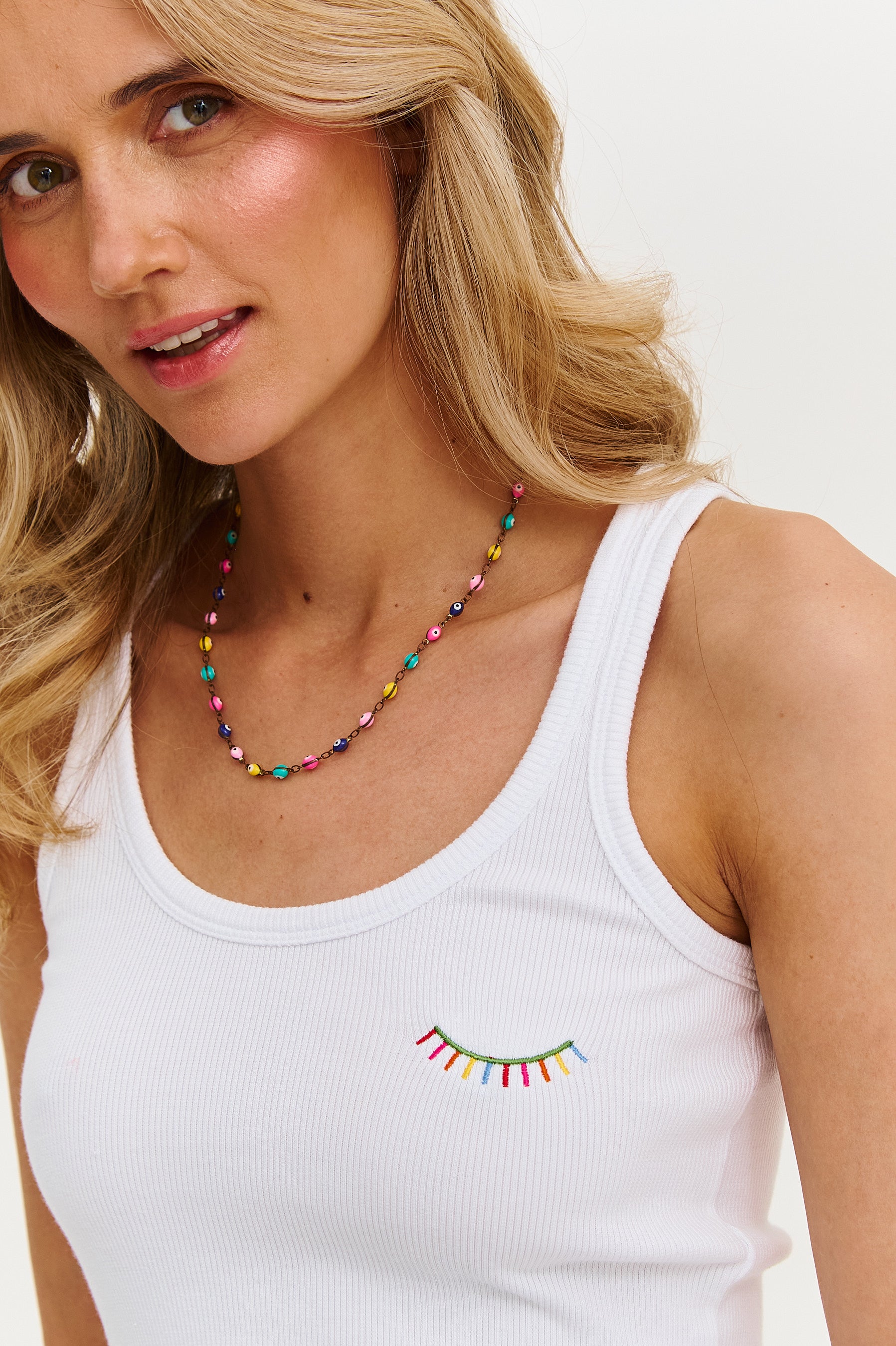 Dieses klassische Racerback-Top wird durch einzigartige Details zum Leben erweckt – die Stickerei und ein kontrastierendes grünes Seitenetikett. Trage es zu Shorts, Leinenhosen oder unter einem Blazer – es passt genauso gut am Meer wie in der Stadt.