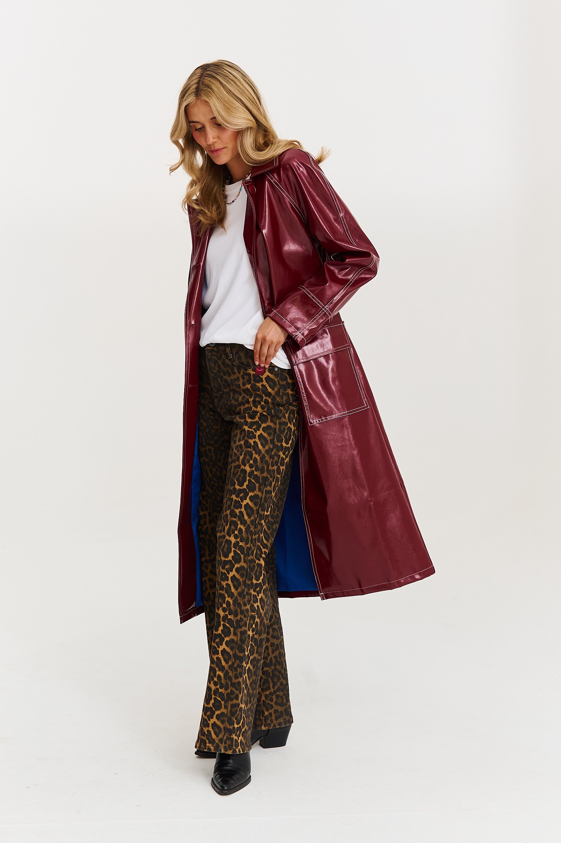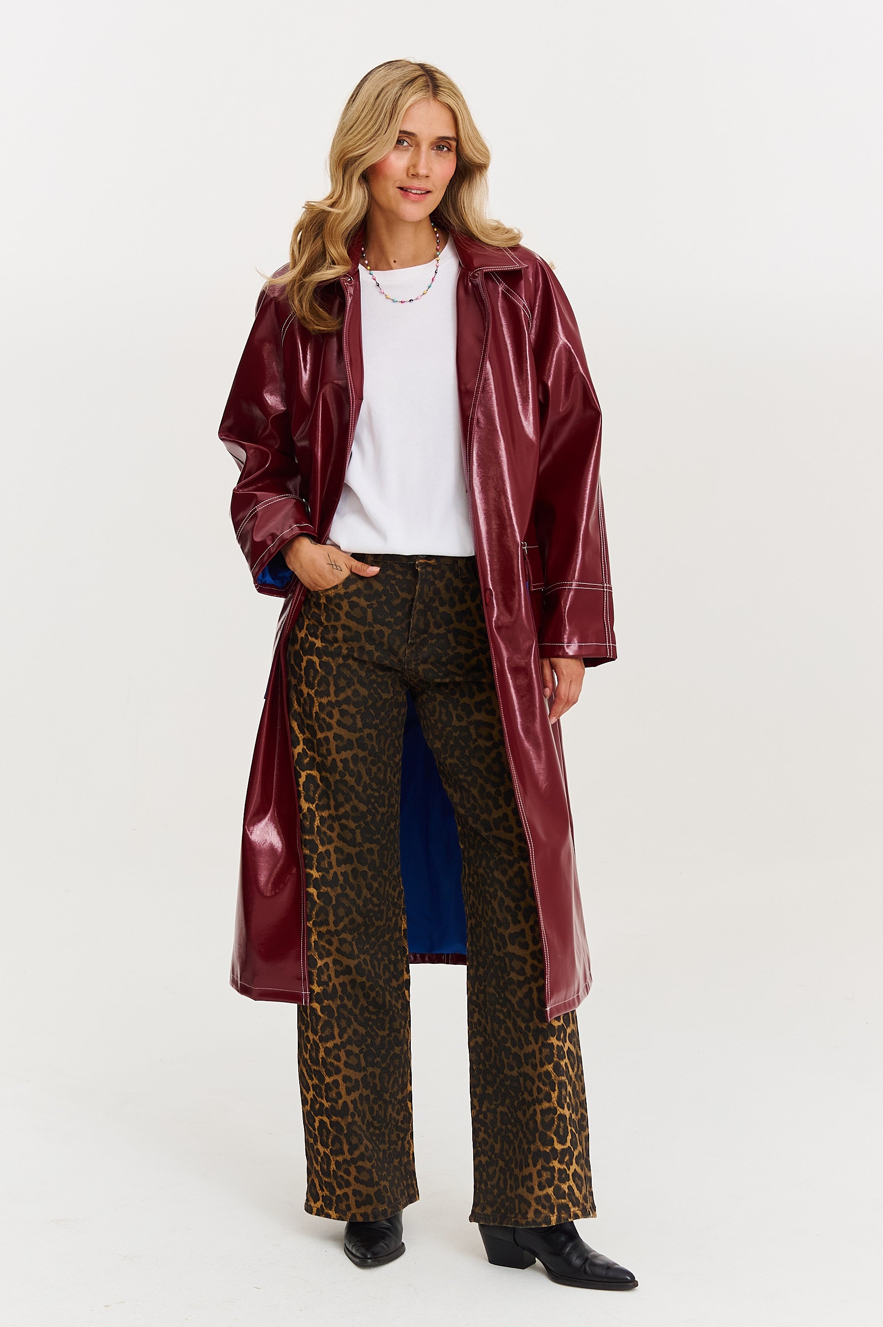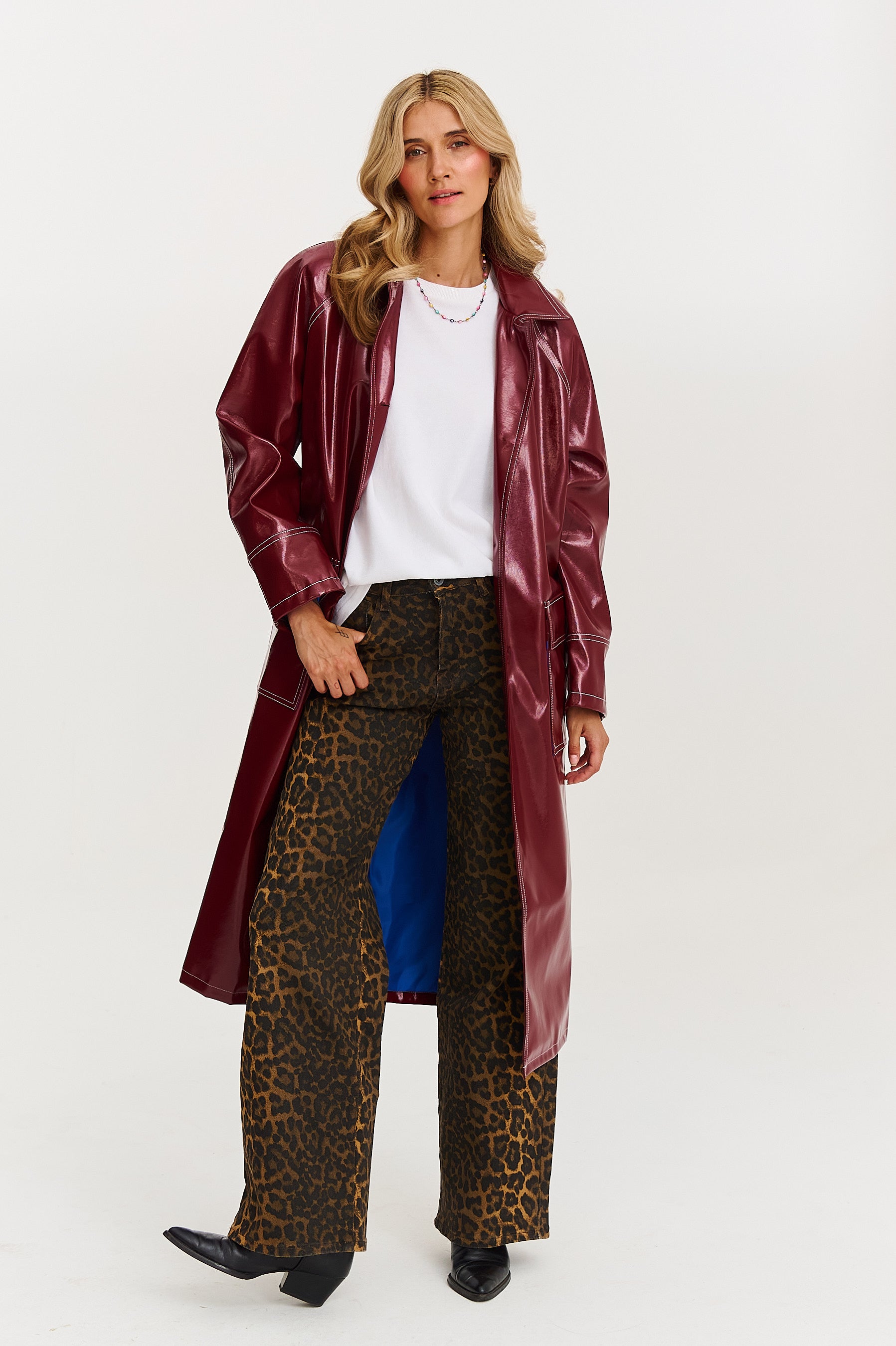 Deep Future Kunstledermantel ist eine Wahl für mutige Frauen, die gerne mit Mode spielen. Das klassische Trenchcoat-Design besteht aus glänzendem Kunstleder, und das Innere zeigt ein energiegeladenes kobaltblaues Futter. Dies ist ein Mantel, der das gesamte Outfit definiert.