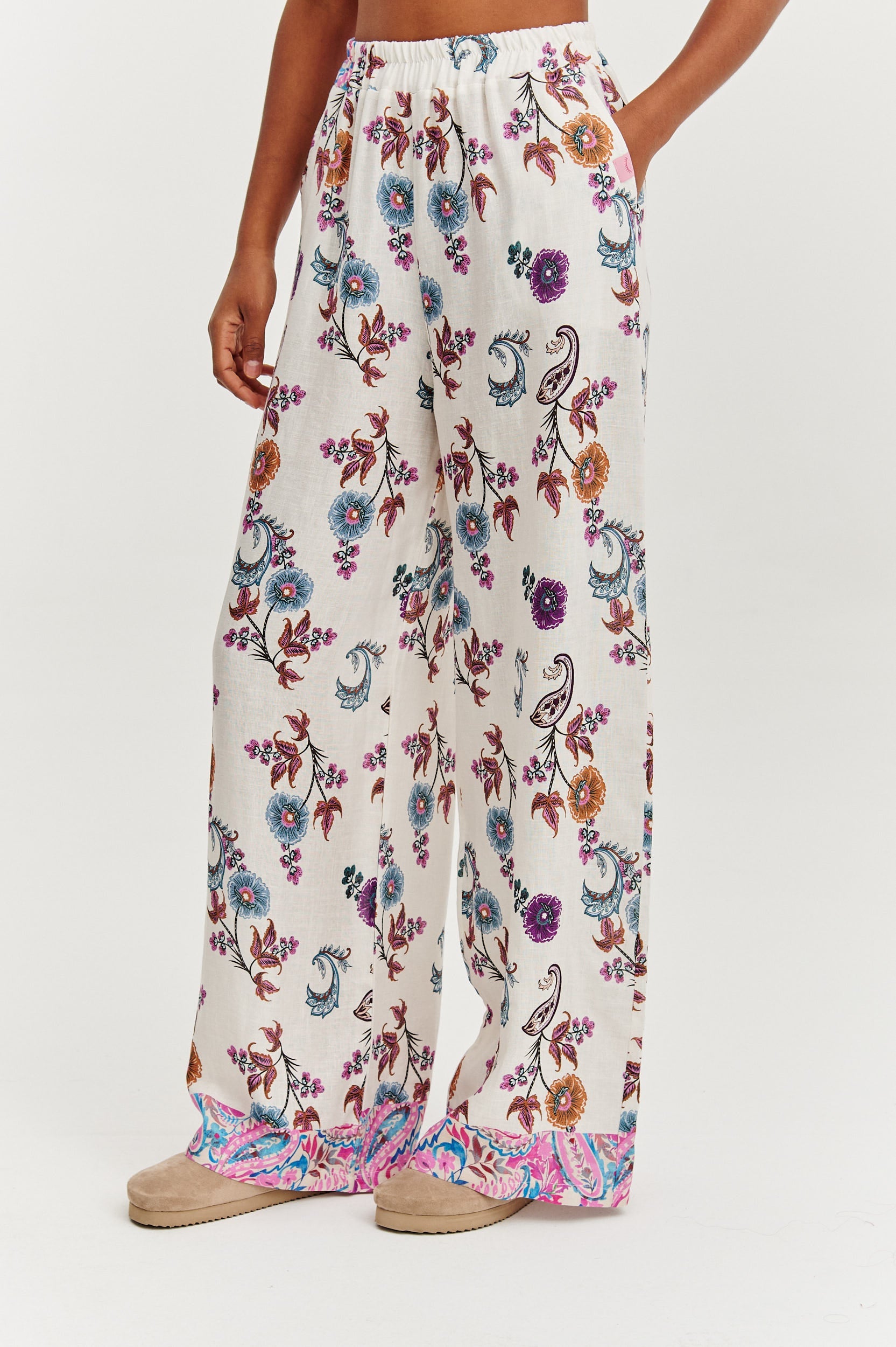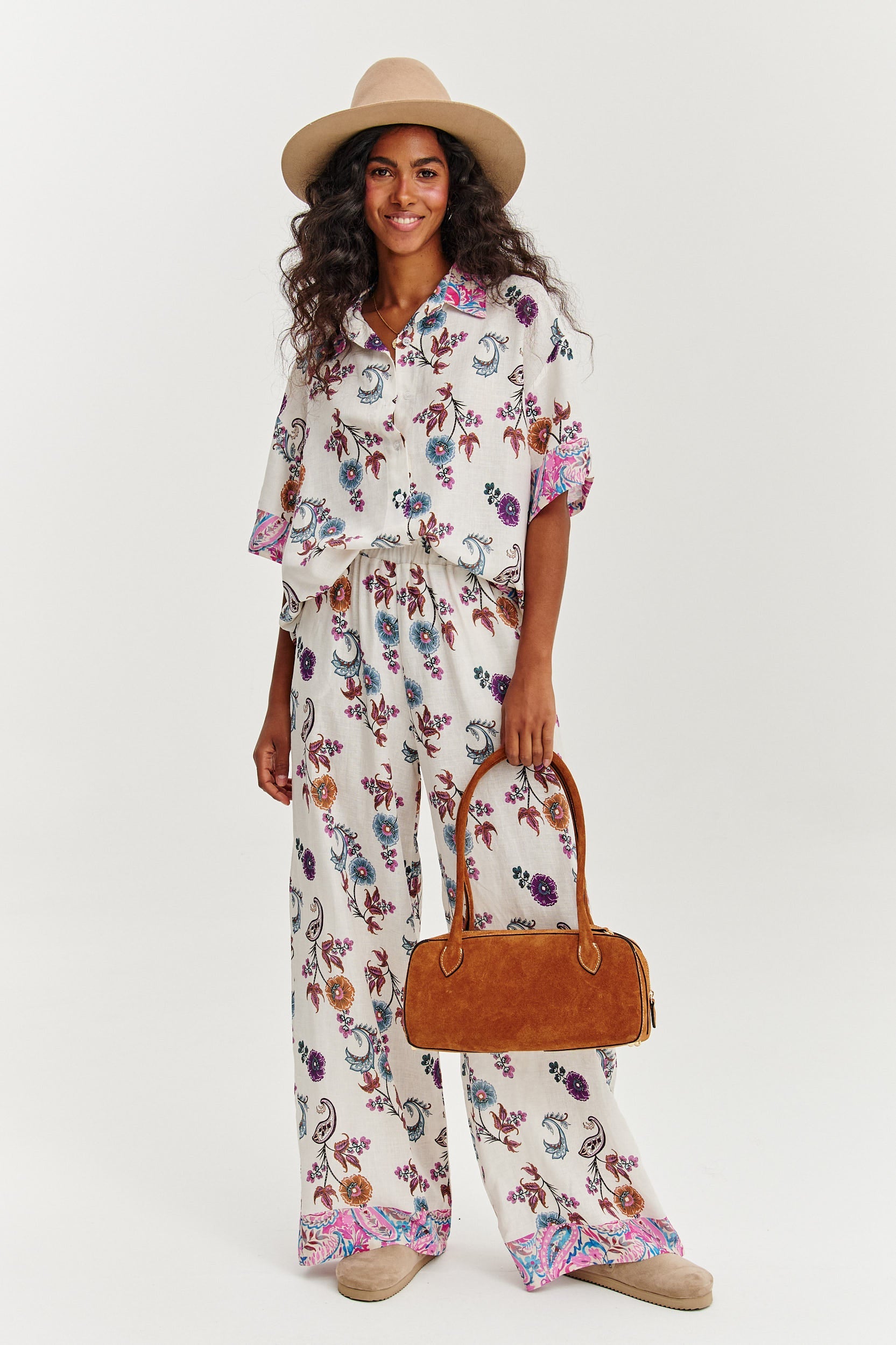 Wenn Sie von einem Look träumen, der in der Menge heraussticht, sind die Desert Blossom Leinenhose mit weitem Bein genau das, was Sie brauchen. Ihr auffälliger Print ist eine Explosion von Farben – Pink, Blau und Lila – die Sie in die Atmosphäre unbeschwerter Festivals und Sommerreisen zurückversetzt.