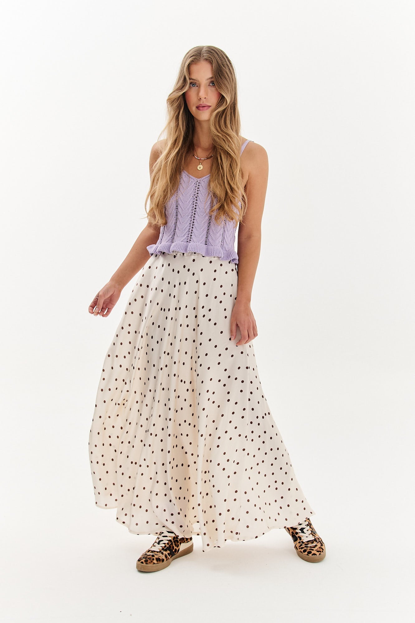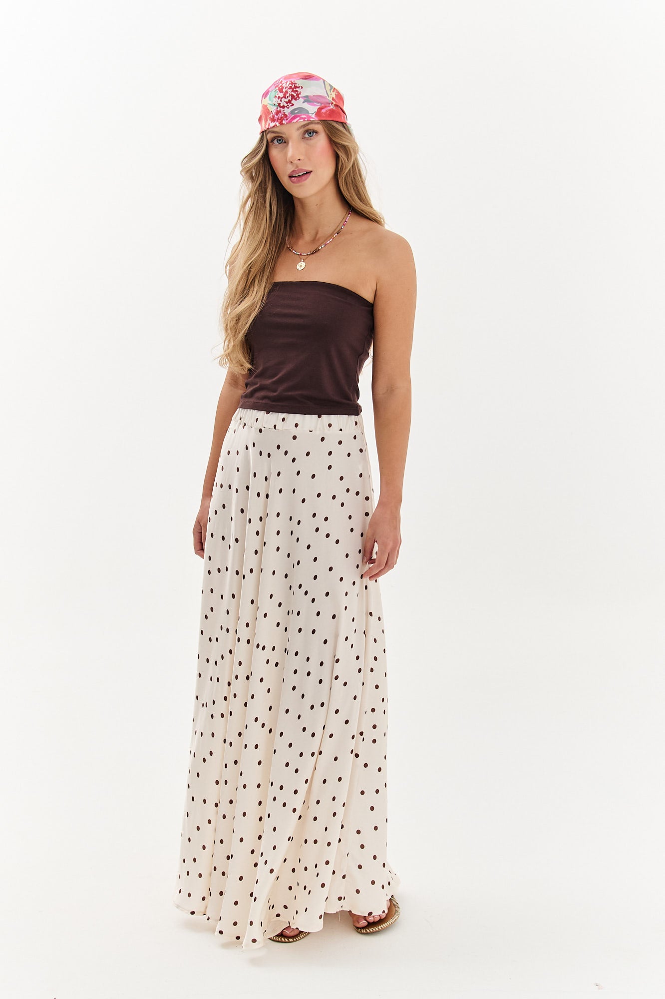 Tauche ein in sommerliche Eleganz mit dem Dot Affair Maxirock – gefertigt aus luftiger Viskose, die bei jedem Schritt sanft mitschwingt. Die weiche Creme-Basis mit zartem Schokopunkt-Muster verleiht einen charmanten Retro-Touch mit modernem Twist.