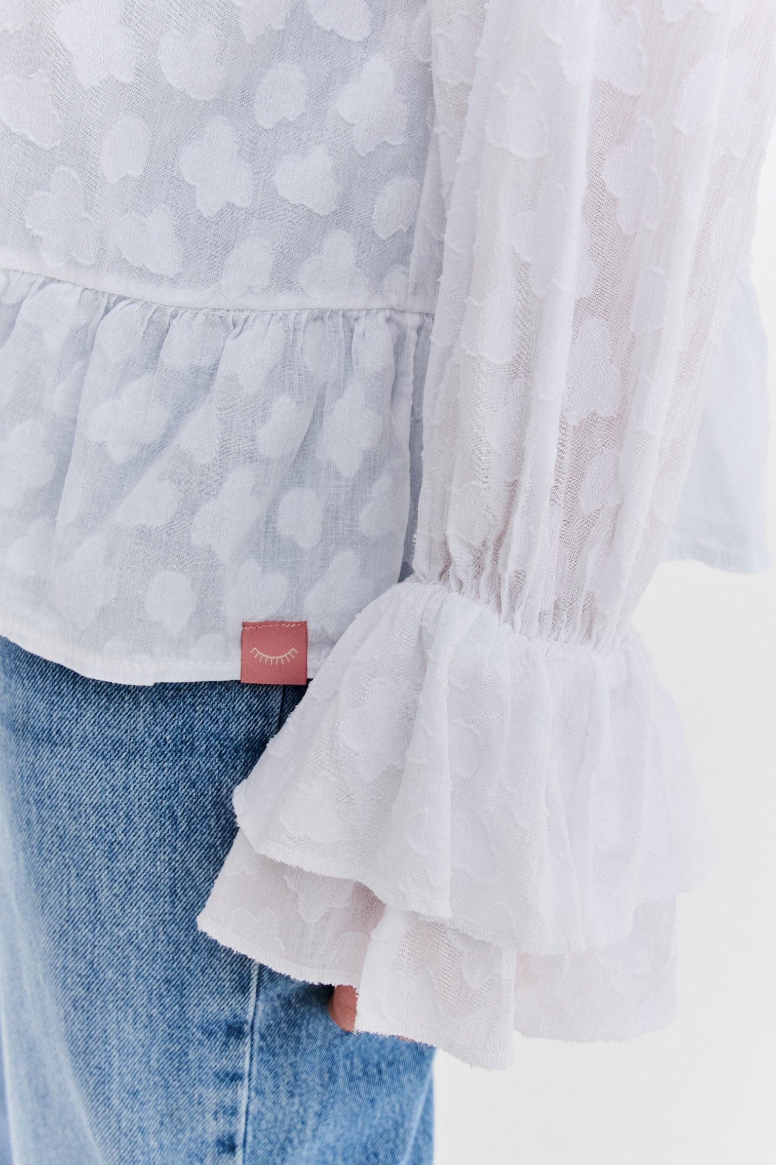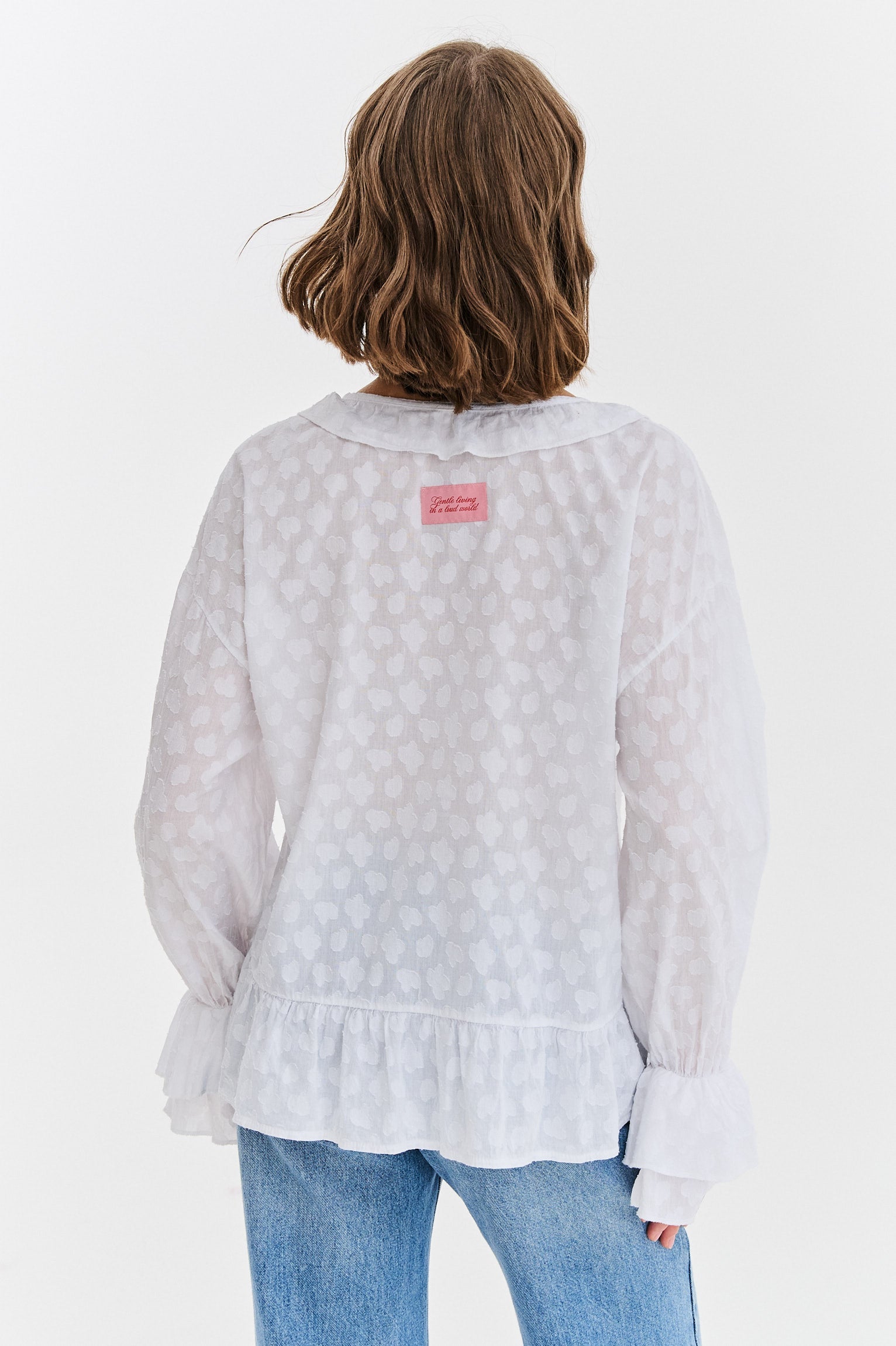 Everyday Romance Hemd ist die Quintessenz der Romantik für den Alltag. Es wurde für Frauen entworfen, die subtile, aber dennoch ausdrucksstarke Details lieben. Sein größter Vorteil sind die Rüschen, die den V-Ausschnitt, die breiten Manschetten und den unteren Saum schmücken und so einen Schößcheneffekt erzeugen.