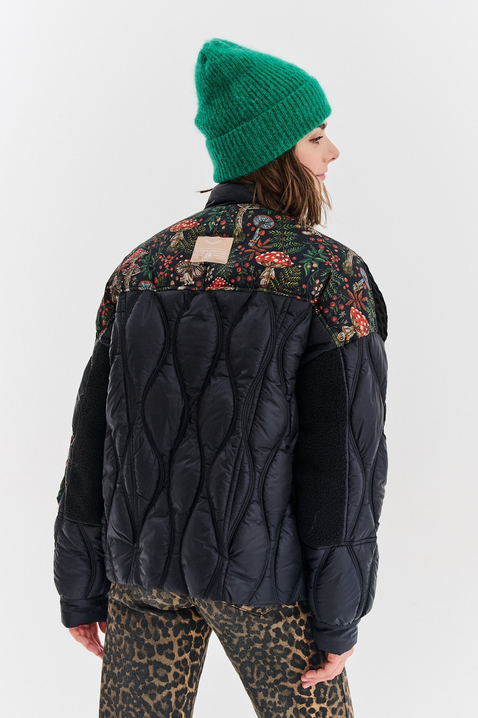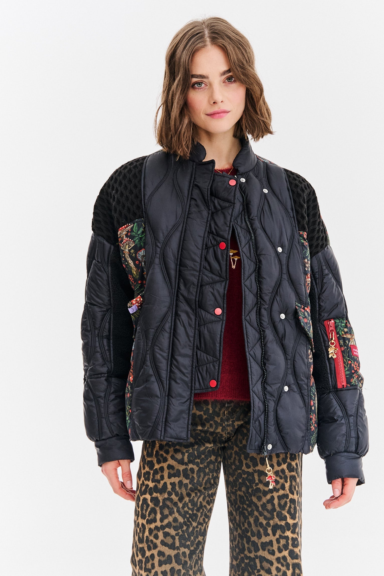 Fairytale Forest gesteppte Bomberjacke ist eine einzigartige Kombination aus klassischem Schnitt und originellem Design. Einsätze mit einem kunstvollen Waldmuster und Paneele aus unterschiedlich strukturiertem Material erzeugen einen Patchwork-Effekt, der ein absoluter Hit ist. Die Jacke ist leicht, aber dennoch warm – perfekt für Herbst und Frühling.