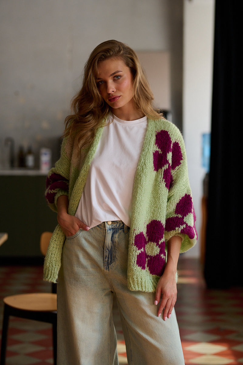 Der lockere, oversized Schnitt mit überschnittenen Schultern und der Zusatz von Wolle und Alpaka im Stoff sorgen für vollständigen Komfort und Bewegungsfreiheit, während die weiten Ärmel mit Rippbündchen das gemütliche Gefühl verstärken. Du kannst den Cardigan über ein T-Shirt, Kleid oder Top werfen – er passt sowohl zu Alltagsoutfits als auch als starker Akzent in gewagteren Kombinationen.
