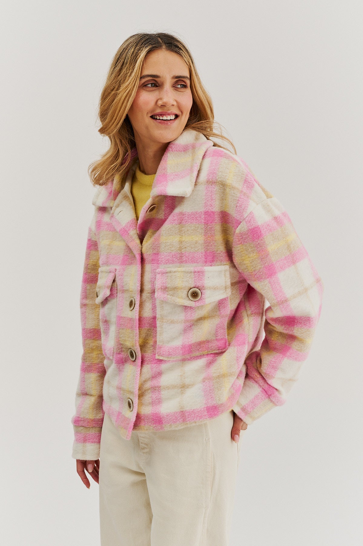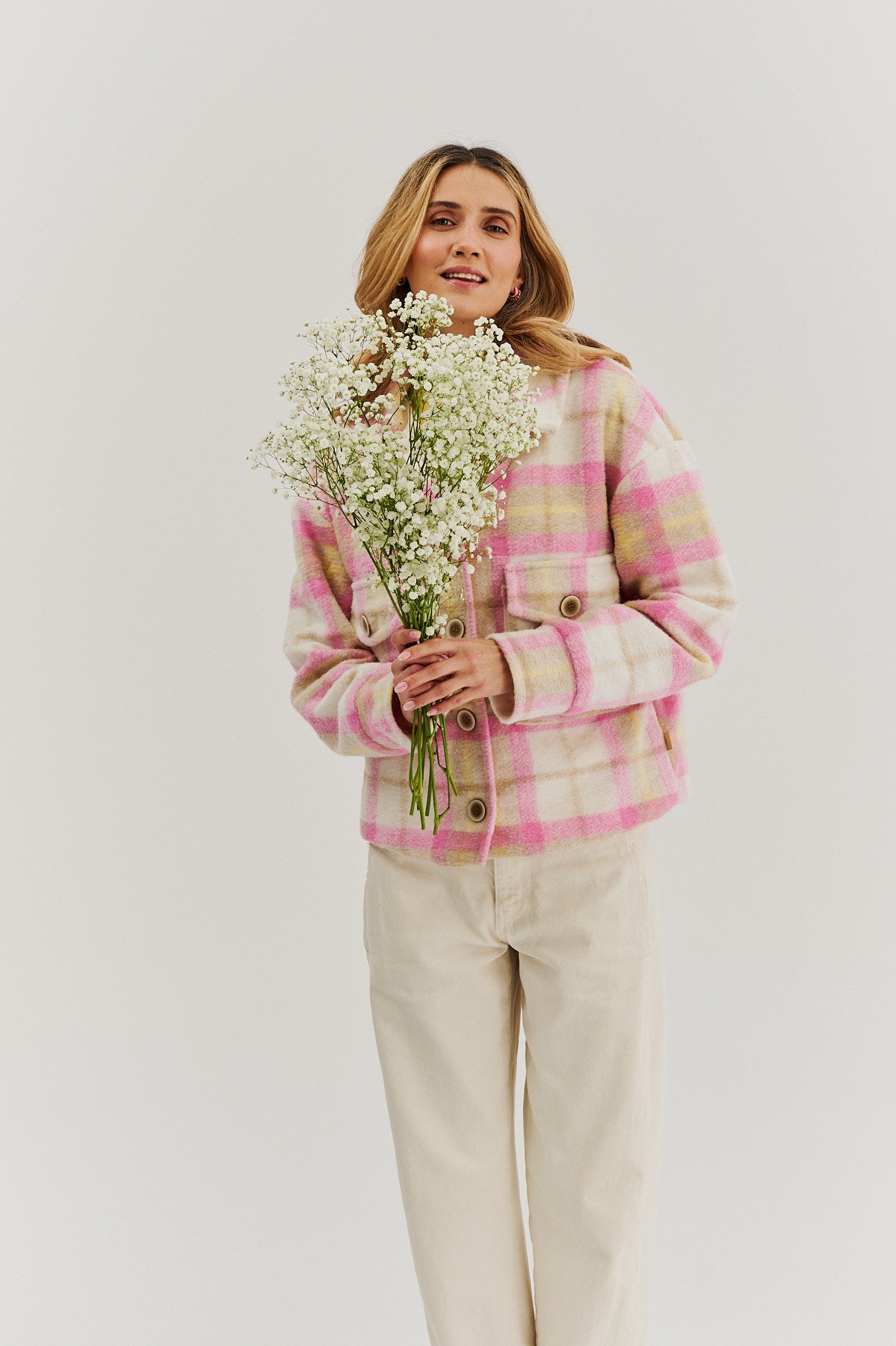 Fresh Start Hemdjacke ist ein Vorschlag, der selbst den trübsten Morgen Farbe verleiht. Das karierte Muster in Pastelltönen von Beige und Rosa ist die perfekte Kombination aus Klassik und Frische, die sofort die Blicke auf sich zieht. Der warme, weiche Stoff mit Wolle hüllt dich an kälteren Tagen ein, und der Oversize-Schnitt sorgt für Komfort und Bewegungsfreiheit.