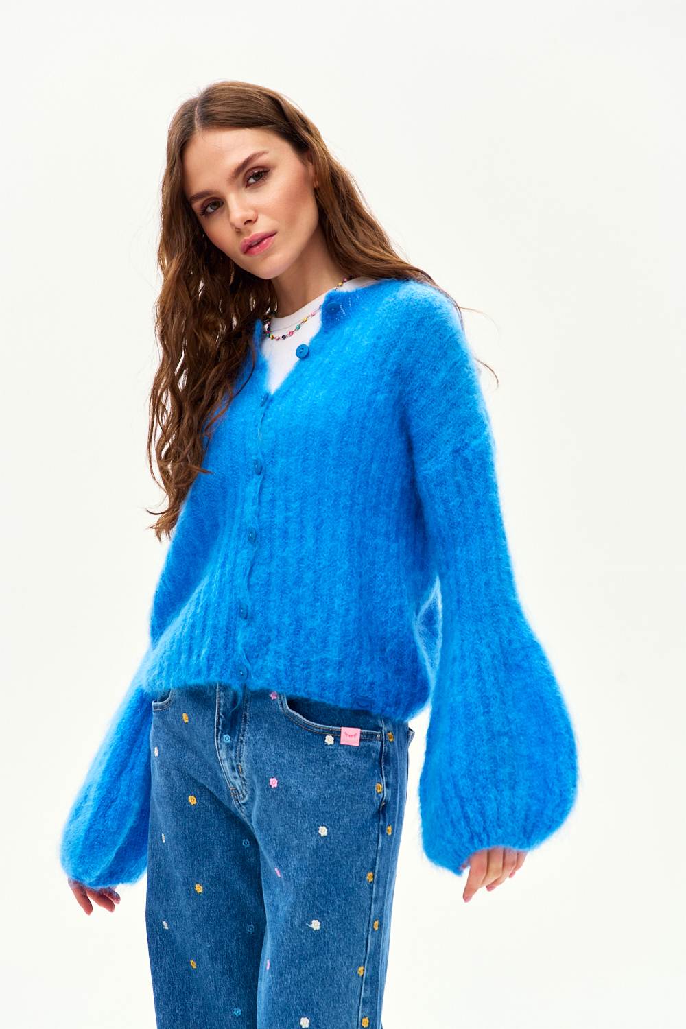 The Here Comes Joy mohair cardigan catches the eye with its intense cobalt color. Wide, balloon sleeves are the detail that defines this design, giving it a fashionable edge. It is soft, fluffy, and incredibly warm—the perfect companion for any season.