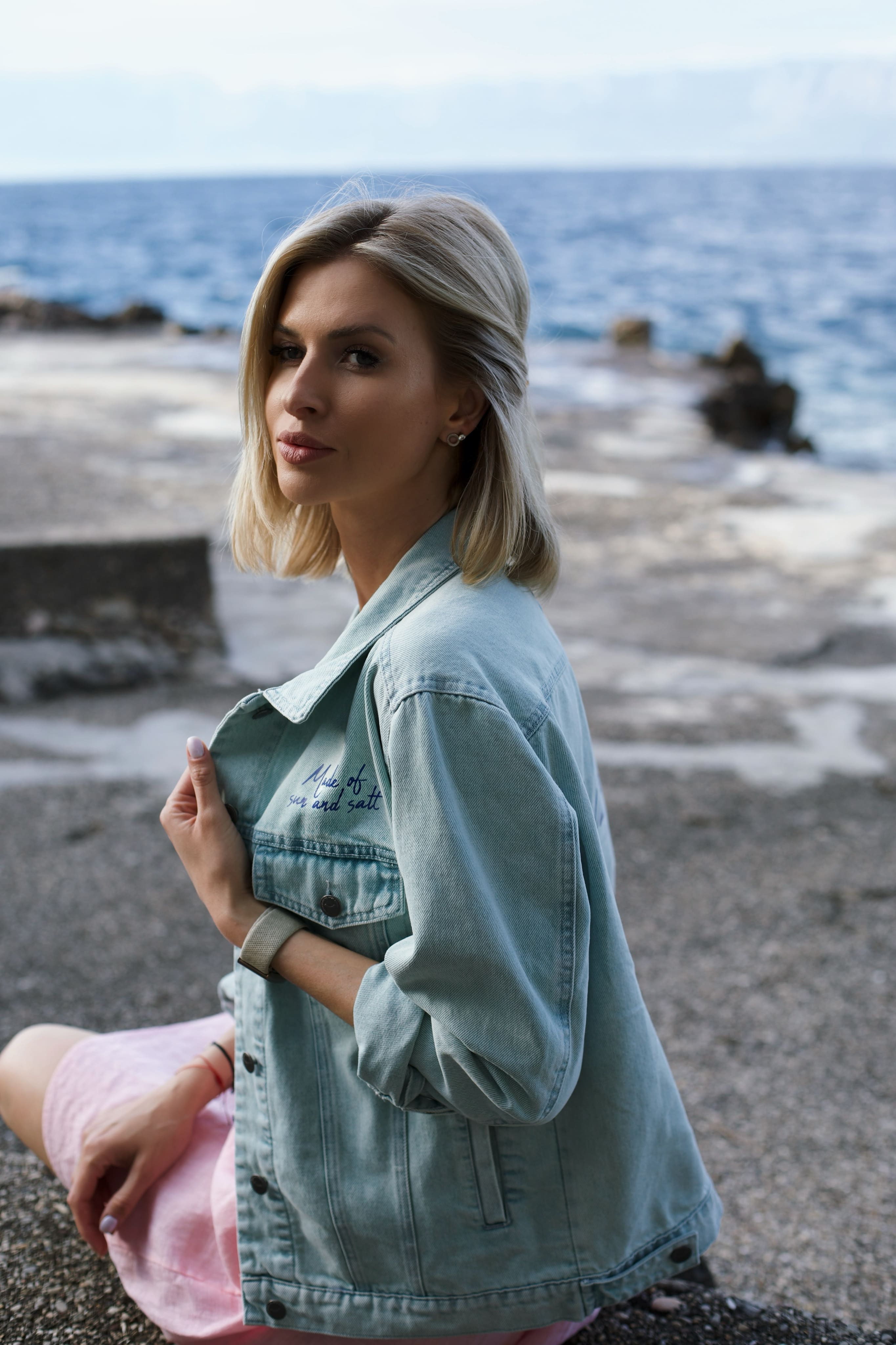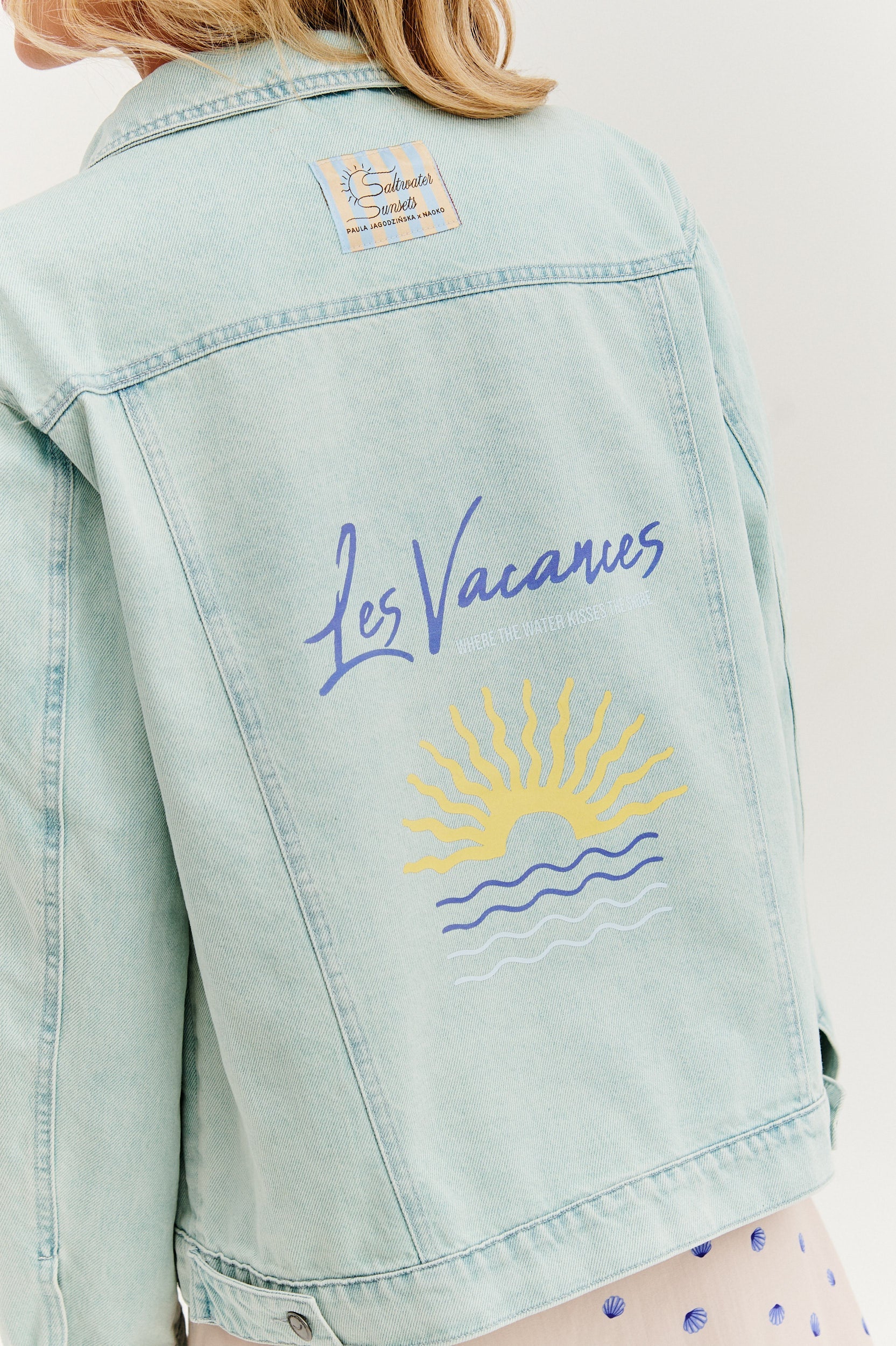 Les Vacances Jeansjacke ist die Essenz sommerlicher Lässigkeit, eingefangen in einem klassischen Schnitt. Weich gewaschener blauer Denim wird durch Urlaubs-Grafiken – Sonne, Wellen und handgeschriebenes „Les Vacances“ – ergänzt, die dich gedanklich an die französische Riviera versetzen.